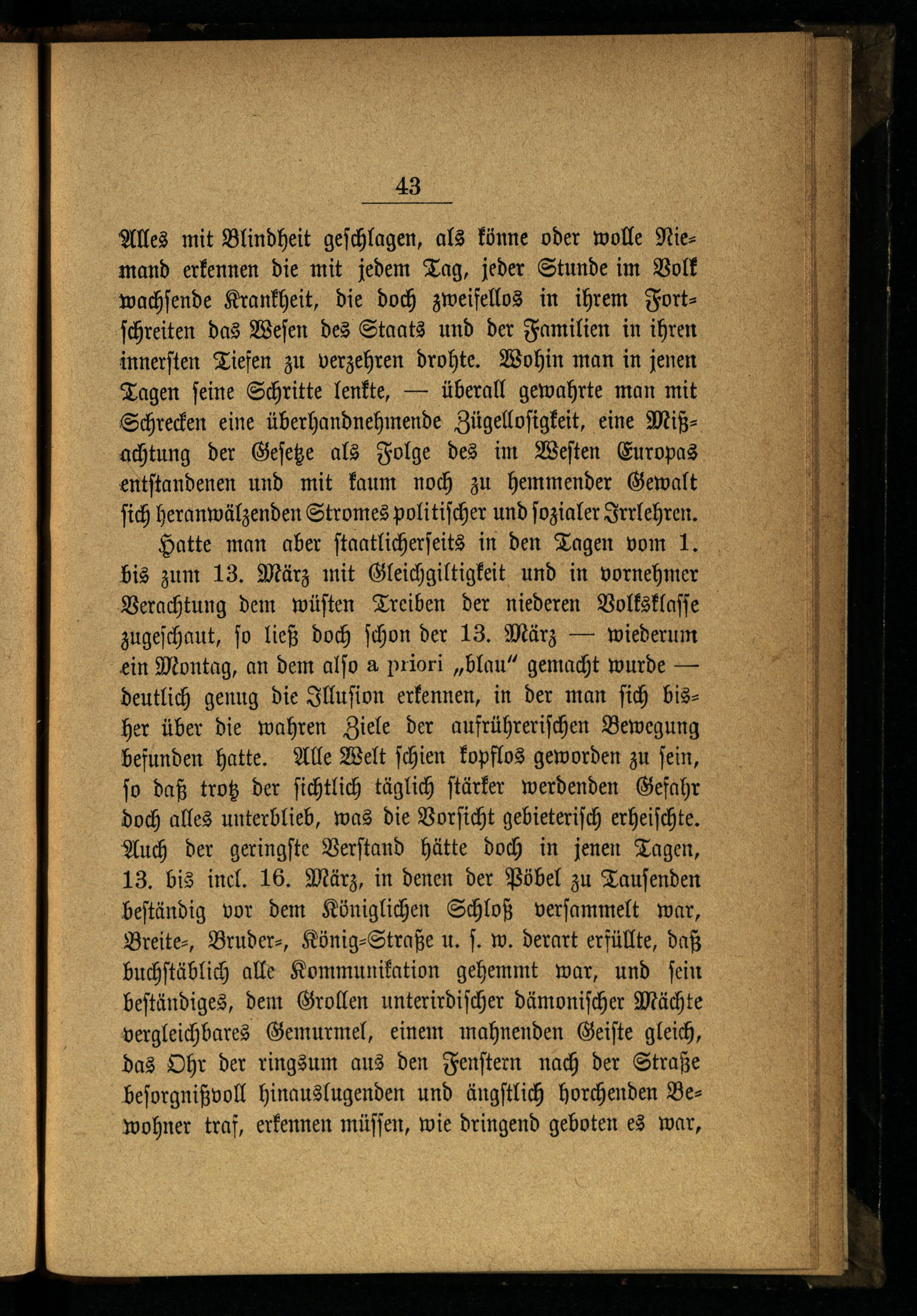 Hatte man aber ſtaatlicherſeits in den Tagen vom 1. bis zum 13. März mit Gleichgiltigkeit und in vornehmer Verachtung dem wüſten Treiben der niederen Volksklaſſe zugeſchaut, ſo ließ doch ſchon der 13. März wiederum ein Montag, an dem alſo a priori„blau“ gemacht wurde— deutlich genug die Illuſion erkennen, in der man ſich bisher über die wahren Ziele der aufrühreriſchen Bewegung befunden hatte. Alle Welt ſchien kopflos geworden zu ſein, ſo daß trotz der ſichtlich täglich ſtärker werdenden Gefahr doch alles unterblieb, was die Vorſicht gebieteriſch erheiſchte. Auch der geringſte Verſtand hätte doch in jenen Tagen, 13. bis incl. 16. März, in denen der Pöbel zu Tauſenden beſtändig vor dem Königlichen Schloß verſammelt war, Breite⸗, Bruder⸗, König⸗Straße u. ſ. w. derart erfüllte, daß buchſtäblich alle Kommunikation gehemmt war, und ſein beſtändiges, dem Grollen unterirdiſcher dämoniſcher Mächte vergleichbares Gemurmel, einem mahnenden Geiſte gleich, das Ohr der ringsum aus den Fenſtern nach der Straße beſorgnißvoll hinauslugenden und ängſtlich horchenden Bewohner traf, erkennen müſſen, wie dringend geboten es war,