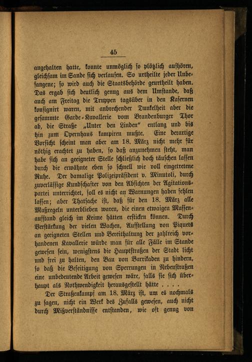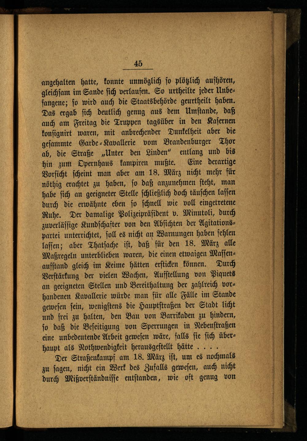 angehalten hatte, konnte unmöglich ſo plötzlich aufhören, gleichſam im Sande ſich verlaufen. So urtheilte jeder Unbefangene; fo wird auch die Staatsbehörde geurtheilt haben. Das ergab ſich deutlich genug aus dem Umſtande, daß auch am Freitag die Truppen tagsüber in den Kaſernen konſignirt waren, mit anbrechender Dunkelheit aber die geſammte Garde⸗Kavallerie vom Brandenburger Thor ab, die Straße„Unter den Linden“ entlang und bis hin zum Opernhaus kampiren mußte. Eine derartige Vorſicht ſcheint man aber am 18. März nicht mehr für nöthig erachtet zu haben, ſo daß anzunehmen ſteht, man habe ſich an geeigneter Stelle ſchließlich doch täuſchen laſſen durch die erwähnte eben ſo ſchnell wie voll eingetretene Ruhe. Der damalige Polizeipräſident v. Minutoli, durch zuverläſſige Kundſchafter von den Abſichten der Agitationspartei unterrichtet, ſoll es nicht an Warnungen haben fehlen laſſen; aber Thatſache iſt, daß für den 18. März alle Maßregeln unterblieben waren, die einen etwaigen Maſſenaufſtand gleich im Keime hätten erſticken können. Durch Verſtärkung der vielen Wachen, Aufſtellung von Piquets an geeigneten Stellen und Bereithaltung der zahlreich vorhandenen Kavallerie würde man für alle Fälle im Stande geweſen fein, wenigſtens die Hauptſtraßen der Stadt licht und frei zu halten, den Bau von Barrikaden zu hindern, ſo daß die Beſeitigung von Sperrungen in Nebenſtraßen eine unbedeutende Arbeit geweſen wäre, falls ſie ſich überhaupt als Nothwendigkeit herausgeſtellt hätte.