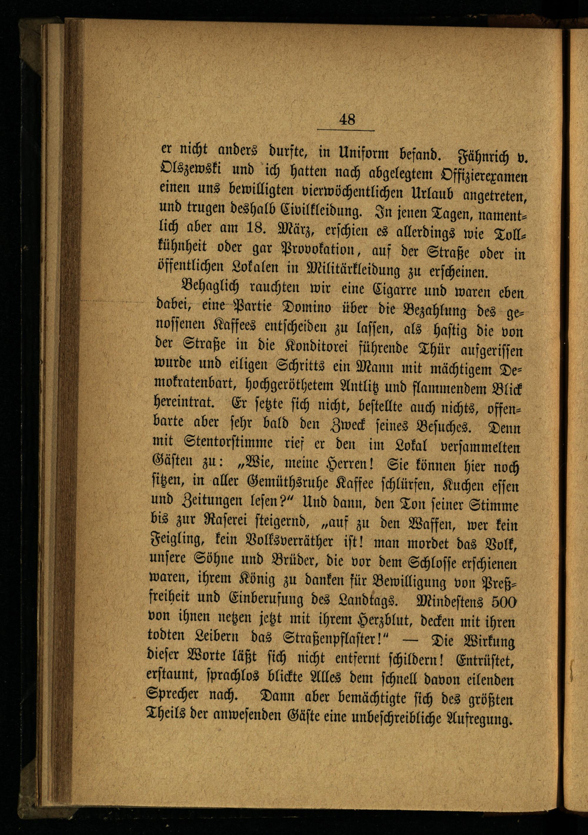 er nicht anders durfte, in Uniform befand. Fähnrich v. Olszewski und ich hatten nach abgelegtem Offizierexamen einen uns bewilligten vierwöchentlichen Urlaub angetreten, und trugen deshalb Civilkleidung. In jenen Tagen, namentlich aber am 18. März, erſchien es allerdings wie Tollkühnheit oder gar Provokation, auf der Straße oder in öffentlichen Lokalen in Militärkleidung zu erſcheinen. Behaglich rauchten wir eine Cigarre und waren eben, dabei, eine Partie Domino über die Bezahlung des genoſſenen Kaffees entſcheiden zu laſſen, als haſtig die von der Straße in die Konditorei führende Thür aufgeriſſen wurde und eiligen Schritts ein Mann mit mächtigem Demokratenbart, hochgeröthetem Antlitz und flammendem Blick hereintrat. Er ſetzte ſich nicht, beſtellte auch nichts, offenbarte aber ſehr bald den Zweck ſeines Beſuches. Denn mit Stentorſtimme rief er den im Lokal verſammelten Gäſten zu:„Wie, meine Herren! Sie können hier noch ſitzen, in aller Gemüthsruhe Kaffee ſchlürfen, Kuchen eſſen und Zeitungen leſen?“ Und dann, den Ton ſeiner Stimme bis zur Raſerei ſteigernd,„auf zu den Waffen, wer kein Feigling, kein Volksverräther iſt! man mordet das Volk, unſere Söhne und Brüder, die vor dem Schloſſe erſchienen waren, ihrem König zu danken für Bewilligung von Preßfreiheit und Einberufung des Landtags. Mindeſtens 500 von ihnen netzen jetzt mit ihrem Herzblut, decken mit ihren todten Leibern das Straßenpflaſter!“— Die Wirkung dieſer Worte läßt ſich nicht entfernt ſchildern! Entrüſtet, erſtaunt, ſprachlos blickte Alles dem ſchnell davon eilenden Sprecher nach. Dann aber bemächtigte ſich des größten Theils der anweſenden Gäſte eine unbeſchreibliche Aufregung.