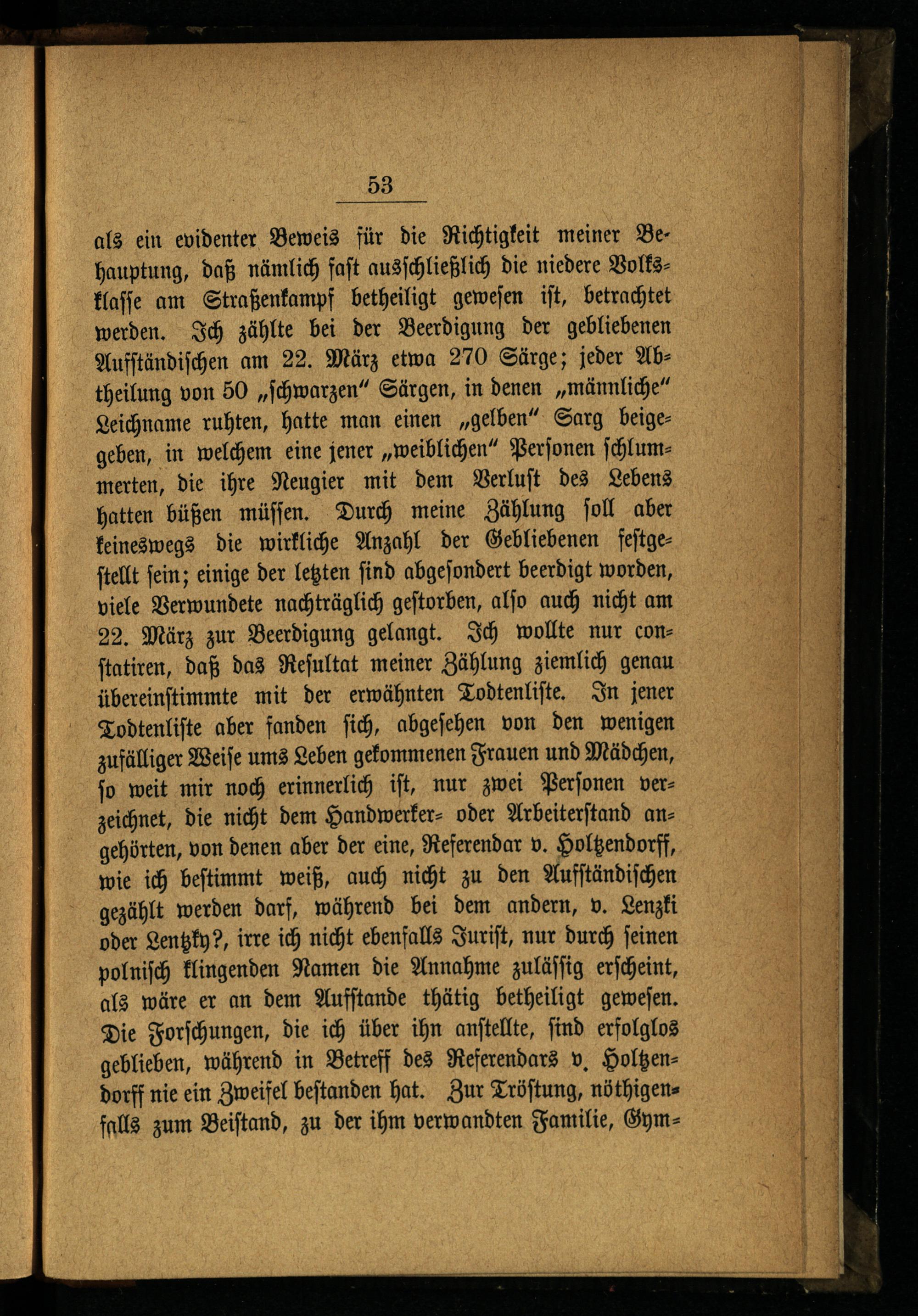 als ein evidenter Beweis für die Richtigkeit meiner Behauptung, daß nämlich faſt ausſchließlich die niedere Volksklaſſe am Straßenkampf betheiligt geweſen iſt, betrachtet werden. Ich zählte bei der Beerdigung der gebliebenen Aufſtändiſchen am 22. März etwa 270 Särge; jeder Abtheilung von 50„ſchwarzen“ Särgen, in denen„männliche“ Leichname ruhten, hatte man einen„gelben“ Sarg beigegeben, in welchem eine jener„weiblichen“ Perſonen ſchlummerten, die ihre Neugier mit dem Verluſt des Lebens hatten büßen müſſen. Durch meine Zählung ſoll aber keineswegs die wirkliche Anzahl der Gebliebenen feſtgeſtellt ſein; einige der letzten ſind abgeſondert beerdigt worden, viele Verwundete nachträglich geſtorben, alſo auch nicht am 22. März zur Beerdigung gelangt. Ich wollte nur conſtatiren, daß das Reſultat meiner Zählung ziemlich genau übereinſtimmte mit der erwähnten Todtenliſte. In jener Todtenliſte aber fanden ſich, abgeſehen von den wenigen zufälliger Weiſe ums Leben gekommenen Frauen und Mädchen, ſo weit mir noch erinnerlich iſt, nur zwei Perſonen verzeichnet, die nicht dem Handwerker- oder Arbeiterſtand angehörten, von denen aber der eine, Referendar v. Holtzendorff, wie ich beſtimmt weiß, auch nicht zu den Aufſtändiſchen gezählt werden darf, während bei dem andern, v. Lenzki oder Lentzky?, irre ich nicht ebenfalls Juriſt, nur durch feinen polnisch klingenden Namen die Annahme zuläſſig erſcheint, als wäre er an dem Aufſtande thätig betheiligt geweſen. Die Forſchungen, die ich über ihn anſtellte, ſind erfolglos geblieben, während in Betreff des Referendars v. Holtzendorff nie ein Zweifel beſtanden hat. Zur Tröſtung, nöthigenfalls zum Beiſtand, zu der ihm verwandten Familie, Gym
