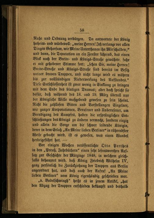 Vor einigen Wochen veröffentlichte Otto Perthes in den„Preuß. Jahrbüchern“ einen ſehr leſenswerthen Aufſatz zur Geſchichte der Märztage 1848, in welchem gleichfalls behauptet wird, daß König Friedrich Wilhelm IV. ganz perſönlich die Zurückziehung der Truppen aus Berlin angeordnet hat, und daß auch der Aufruf„An Meine lieben Berliner“ vom König eigenhändig geſchrieben war.