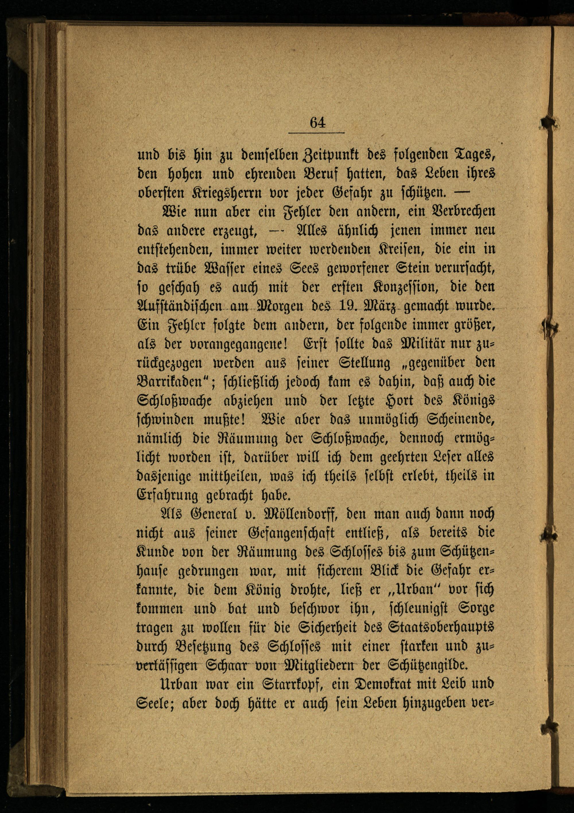 Wie nun aber ein Fehler den andern, ein Verbrechen das andere erzeugt,— Alles ähnlich jenen immer neu entſtehenden, immer weiter werdenden Kreiſen, die ein in das trübe Waſſer eines Sees geworfener Stein verurſacht, ſo geſchah es auch mit der erſten Konzeſſion, die den Aufſtändiſchen am Morgen des 19. März gemacht wurde. Ein Fehler folgte dem andern, der folgende immer größer, als der vorangegangene! Erſt ſollte das Militär nur zurückgezogen werden aus ſeiner Stellung„gegenüber den Barrikaden“; ſchließlich jedoch kam es dahin, daß auch die Schloßwache abziehen und der letzte Hort des Königs ſchwinden mußte! Wie aber das unmöglich Scheinende, nämlich die Räumung der Schloßwache, dennoch ermöglicht worden iſt, darüber will ich dem geehrten Leſer alles dasjenige mittheilen, was ich theils ſelbſt erlebt, theils in Erfahrung gebracht habe.