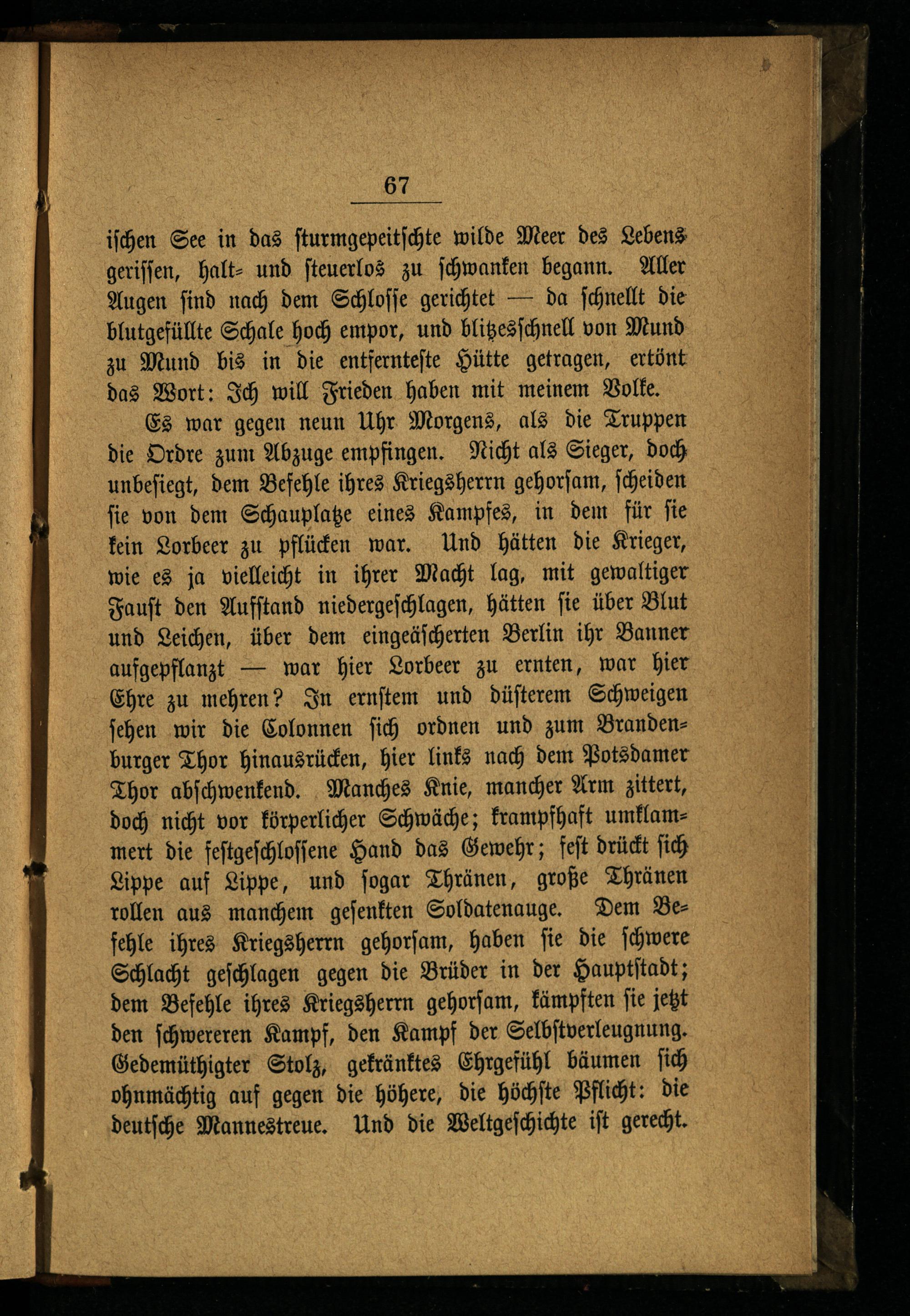 iſchen See in das ſturmgepeitſchte wilde Meer des Lebens geriſſen, halt⸗ und ſteuerlos zu ſchwanken begann. Aller Augen find nach dem Schloſſe gerichtet— da ſchnellt die blutgefüllte Schale hoch empor, und blitzesſchnell von Mund zu Mund bis in die entfernteſte Hütte getragen, ertönt das Wort: Ich will Frieden haben mit meinem Volke. Es war gegen neun Uhr Morgens, als die Truppen die Ordre zum Abzuge empfingen. Nicht als Sieger, doch unbeſiegt, dem Befehle ihres Kriegsherrn gehorſam, ſcheiden ſie von dem Schauplatze eines Kampfes, in dem für ſie kein Lorbeer zu pflücken war. Und hätten die Krieger, wie es ja vielleicht in ihrer Macht lag, mit gewaltiger Fauſt den Aufſtand niedergeſchlagen, hätten fie über Blut und Leichen, über dem eingeäſcherten Berlin ihr Banner aufgepflanzt— war hier Lorbeer zu ernten, war hier Ehre zu mehren? In ernſtem und düſterem Schweigen ſehen wir die Colonnen ſich ordnen und zum Brandenburger Thor hinausrücken, hier links nach dem Potsdamer Thor abſchwenkend. Manches Knie, mancher Arm zittert, doch nicht vor körperlicher Schwäche; krampfhaft umklammert die feſtgeſchloſſene Hand das Gewehr; feſt drückt ſich Lippe auf Lippe, und ſogar Thränen, große Thränen rollen aus manchem geſenkten Soldatenauge. Dem Befehle ihres Kriegsherrn gehorſam, haben ſie die ſchwere Schlacht geſchlagen gegen die Brüder in der Hauptſtadt; dem Befehle ihres Kriegsherrn gehorſam, kämpften ſie jetzt den ſchwereren Kampf, den Kampf der Selbſtverleugnung. Gedemüthigter Stolz, gekränktes Ehrgefühl bäumen ſich ohnmächtig auf gegen die höhere, die höchſte Pflicht: die deutſche Mannestreue. Und die Weltgeſchichte iſt gerecht.