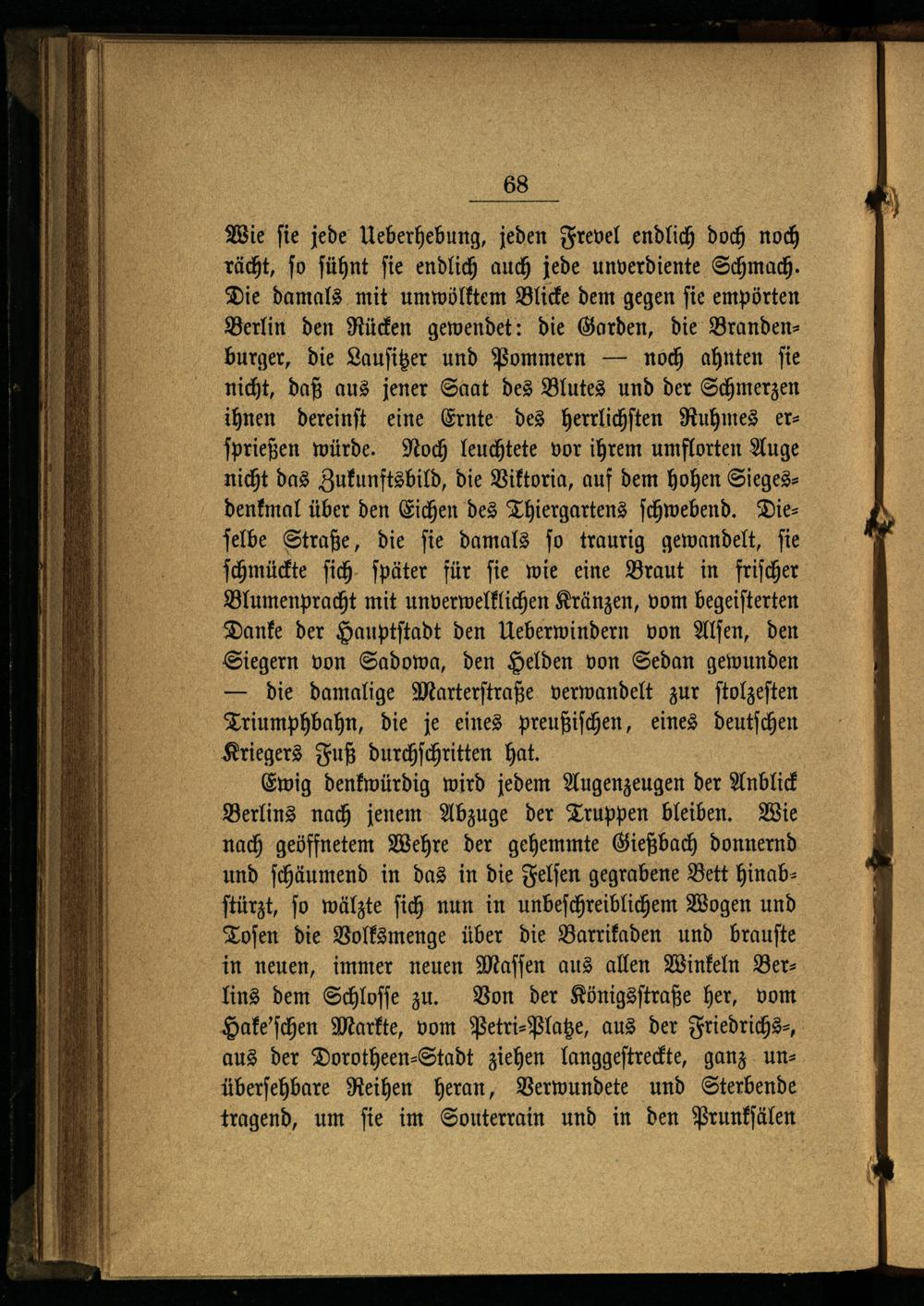 Wie fie jede Ueberhebung, jeden Frevel endlich doch noch rächt, ſo ſühnt ſie endlich auch jede unverdiente Schmach. Die damals mit umwölktem Blicke dem gegen ſie empörten Berlin den Rücken gewendet: die Garden, die Brandenburger, die Lauſitzer und Pommern— noch ahnten ſie nicht, daß aus jener Saat des Blutes und der Schmerzen ihnen dereinſt eine Ernte des herrlichſten Ruhmes erſprießen würde. Noch leuchtete vor ihrem umflorten Auge nicht das Zukunftsbild, die Viktoria, auf dem hohen Siegesdenkmal über den Eichen des Thiergartens ſchwebend. Dieſelbe Straße, die ſie damals ſo traurig gewandelt, ſie ſchmückte ſich ſpäter für ſie wie eine Braut in friſcher Blumenpracht mit unverwelklichen Kränzen, vom begeiſterten Danke der Hauptſtadt den Ueberwindern von Alſen, den Siegern von Sadowa, den Helden von Sedan gewunden — die damalige Marterſtraße verwandelt zur ſtolzeſten Triumphbahn, die je eines preußiſchen, eines deutſchen Kriegers Fuß durchſchritten hat.