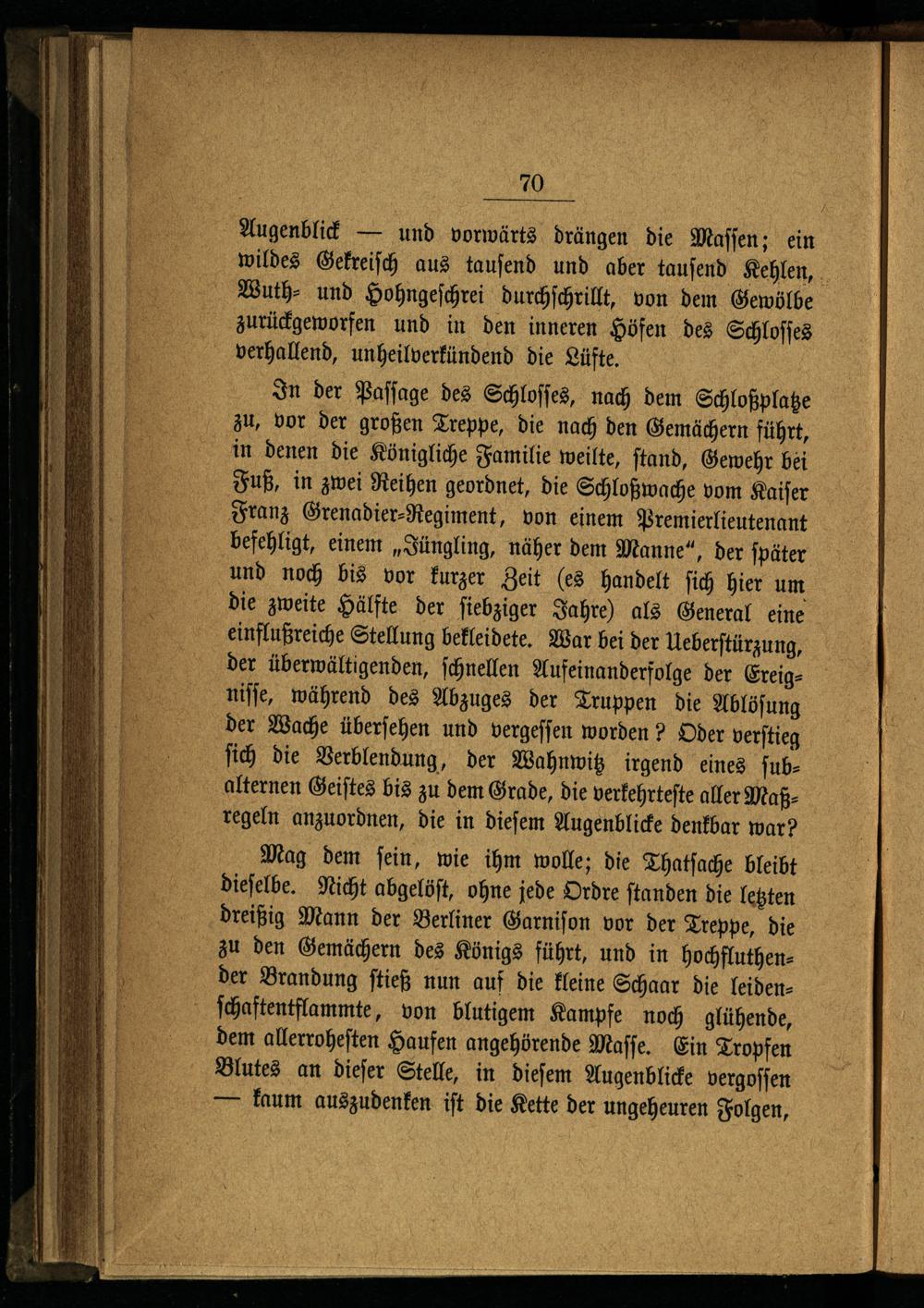 Mag dem ſein, wie ihm wolle; die Thatſache bleibt dieſelbe. Nicht abgelöſt, ohne jede Ordre ſtanden die letzten dreißig Mann der Berliner Garniſon vor der Treppe, die zu den Gemächern des Königs führt, und in hochfluthender Brandung ſtieß nun auf die kleine Schaar die leidenſchaftentflammte, von blutigem Kampfe noch glühende, dem allerroheſten Haufen angehörende Maſſe. Ein Tropfen Blutes an dieſer Stelle, in dieſem Augenblicke vergoſſen — kaum auszudenken iſt die Kette der ungeheuren Folgen,