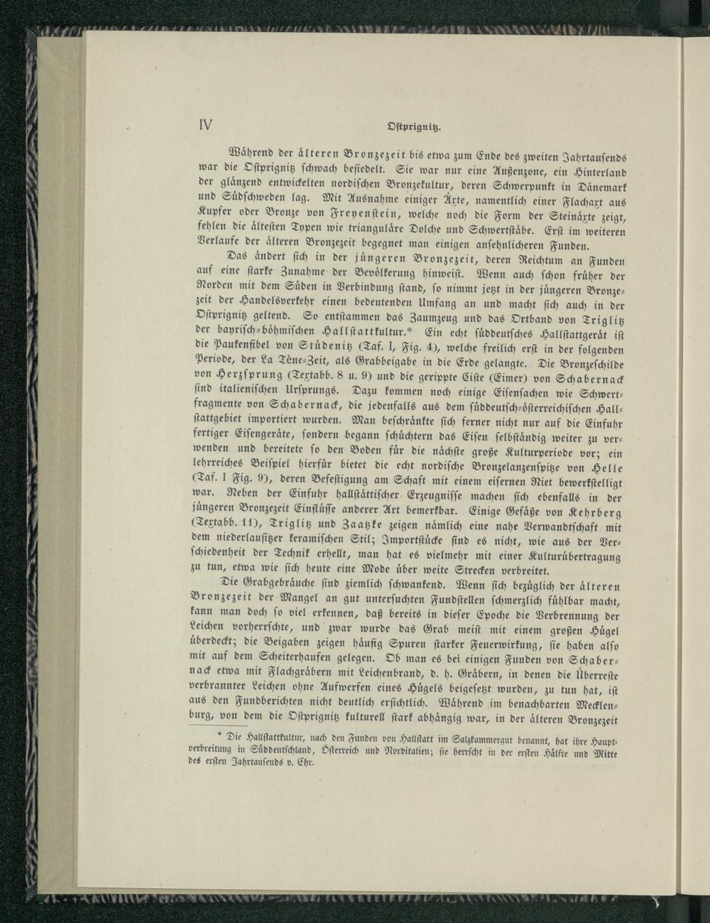 Das ändert ſich in der jüngeren Bronzezeit, deren Reichtum an Funden auf eine ſtarke Zunahme der Bevoͤlkerung hinweiſt. Wenn auch ſchon fruͤher der Norden mit dem Suͤden in Verbindung ſtand, ſo nimmt jetzt in der jüngeren Bronze zeit der Handelsverkehr einen bedeutenden Umfang an und macht ſich auch in der Oſtprignitz geltend. So entſtammen das Zaumzeug und das Ortband von Triglitz der bayriſch-boͤhmiſchen Hallſtattkultur.“ Ein echt ſuͤddeutſches Hallſtattgeraͤt iſt die Paukenſibel von Stuͤdenitz (Taf. I, Fig. 4), welche freilich erſt in der folgenden Periode, der La Tene-Zeit, als Grabbeigabe in die Erde gelangte. Die Bronzeſchilde von Herzſprung(Textabb. 8 u. 9) und die gerippte Ciſte(Eimer) von Schabernack ſind italieniſchen Urſprungs. Dazu kommen noch einige Eiſenſachen wie Schwert— fragmente von Schabernack, die jedenfalls aus dem ſuͤddeutſch⸗oͤſterreichiſchen Hallſtattgebiet importiert wurden. Man beſchraͤnkte ſich ferner nicht nur auf die Einfuhr fertiger Eiſengeraͤte, ſondern begann ſchuͤchtern das Eiſen ſelbſtaͤndig weiter zu ver— wenden und bereitete fo den Boden für die naͤchſte große Kulturperiode vor; ein lehrreiches Beiſpiel hierfuͤr bietet die echt nordiſche Bronzelanzenſpitze von Helle (Taf. I Fig. 9, deren Befeſtigung am Schaft mit einem eiſernen Niet bewerkſtelligt war. Neben der Einfuhr hallſtaͤttiſcher Erzeugniſſe machen ſich ebenfalls in der juͤngeren Bronzezeit Einfluͤſſe anderer Art bemerkbar. Einige Gefaͤße von Kehrberg (Textabb. 11), Triglitz und Zaatzke zeigen naͤmlich eine nahe Verwandtſchaft mit dem niederlauſitzer keramiſchen Stil; Importſtuͤcke ſind es nicht, wie aus der Ver— ſchiedenheit der Technik erhellt, man hat es vielmehr mit einer Kulturuͤbertragung zu tun, etwa wie ſich heute eine Mode uͤber weite Strecken verbreitet.