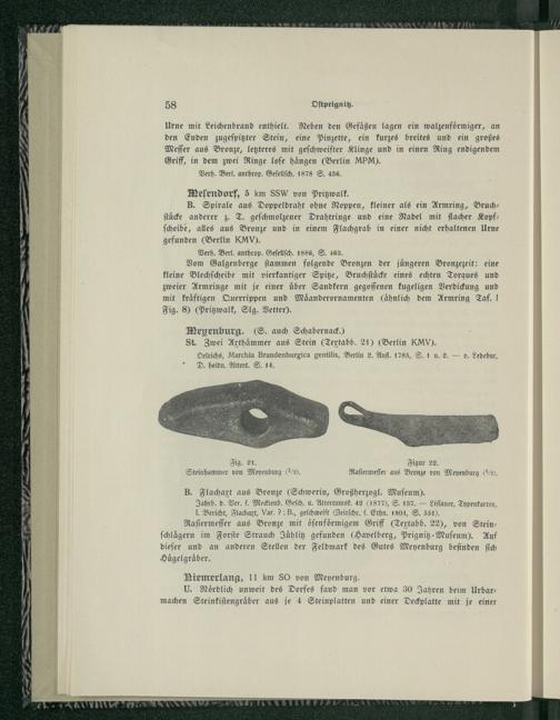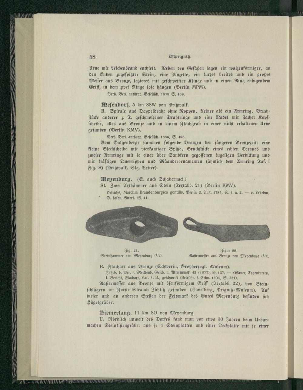 Raſiermeſſer aus Bronze mit oͤſenfoͤrmigem Griff(Textabb. 22), von Stein— ſchlaͤgern im Forſte Strauch Juͤhlitz gefunden(Havelberg , Prignitz⸗Muſeum). Auf dieſer und an anderen Stellen der Feldmark des Gutes Meyenburg befinden ſich Huͤgelgraͤber.