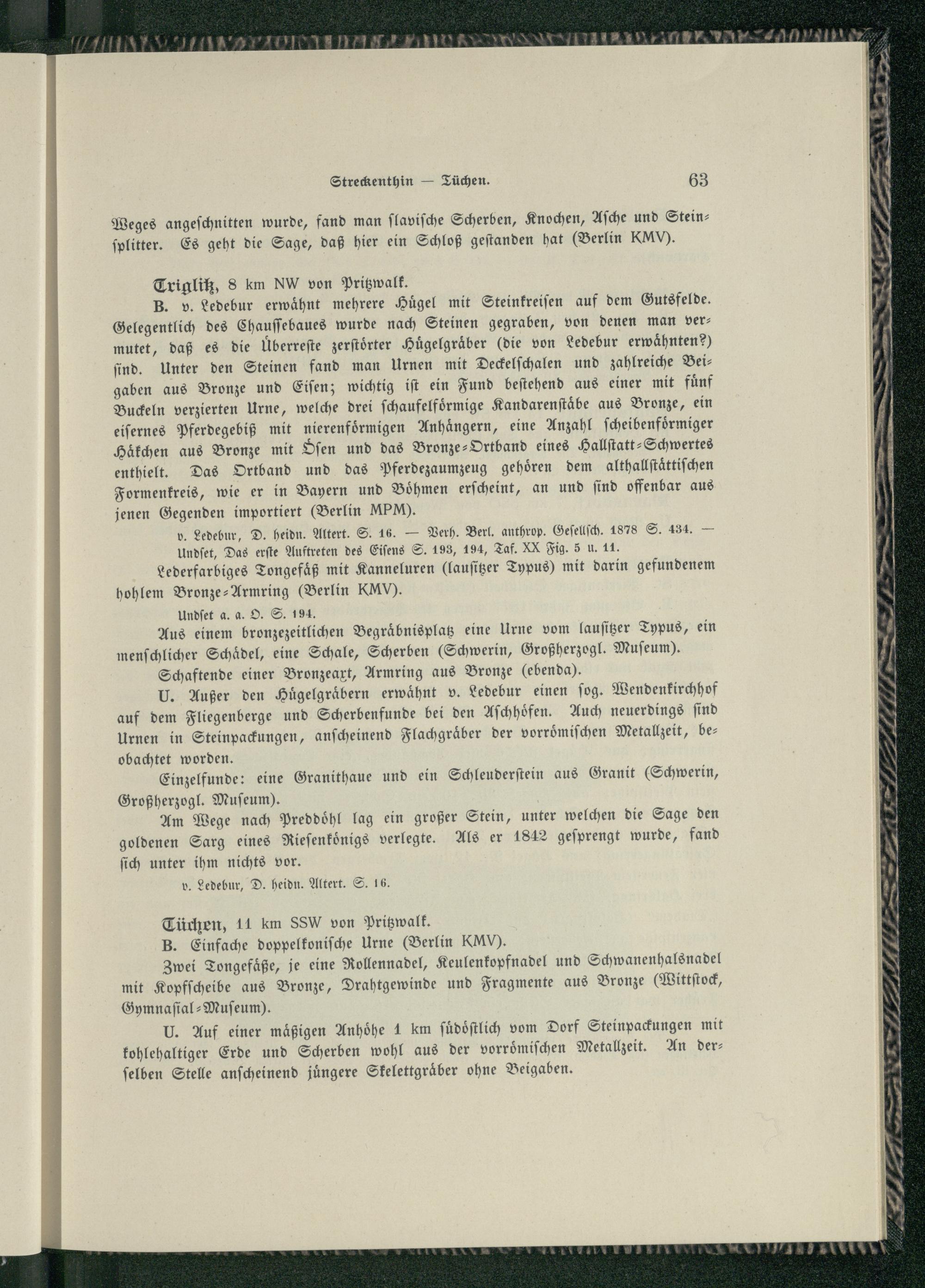 B. v. Ledebur erwähnt mehrere Hügel mit Steinkreiſen auf dem Gutsfelde. Gelegentlich des Chauſſebaues wurde nach Steinen gegraben, von denen man ver; mutet, daß es die uͤberreſte zerſtoͤrter Huͤgelgraͤber(die von Ledebur erwaͤhnten?) ſind. Unter den Steinen fand man Urnen mit Deckelſchalen und zahlreiche Bei— gaben aus Bronze und Eiſen; wichtig iſt ein Fund beſtehend aus einer mit fuͤnf Buckeln verzierten Urne, welche drei ſchaufelfoͤrmige Kandarenſtaͤbe aus Bronze, ein eiſernes Pferdegebiß mit nierenfoͤrmigen Anhaͤngern, eine Anzahl ſcheibenfoͤrmiger Haͤkchen aus Bronze mit Oſen und das Bronze-Ortband eines Hallſtatt -Schwertes enthielt. Das Ortband und das Pferdezaumzeug gehoͤren dem althallſtaͤttiſchen Formenkreis, wie er in Bayern und Boͤhmen erſcheint, an und ſind offenbar aus jenen Gegenden importiert(Berlin MPM.