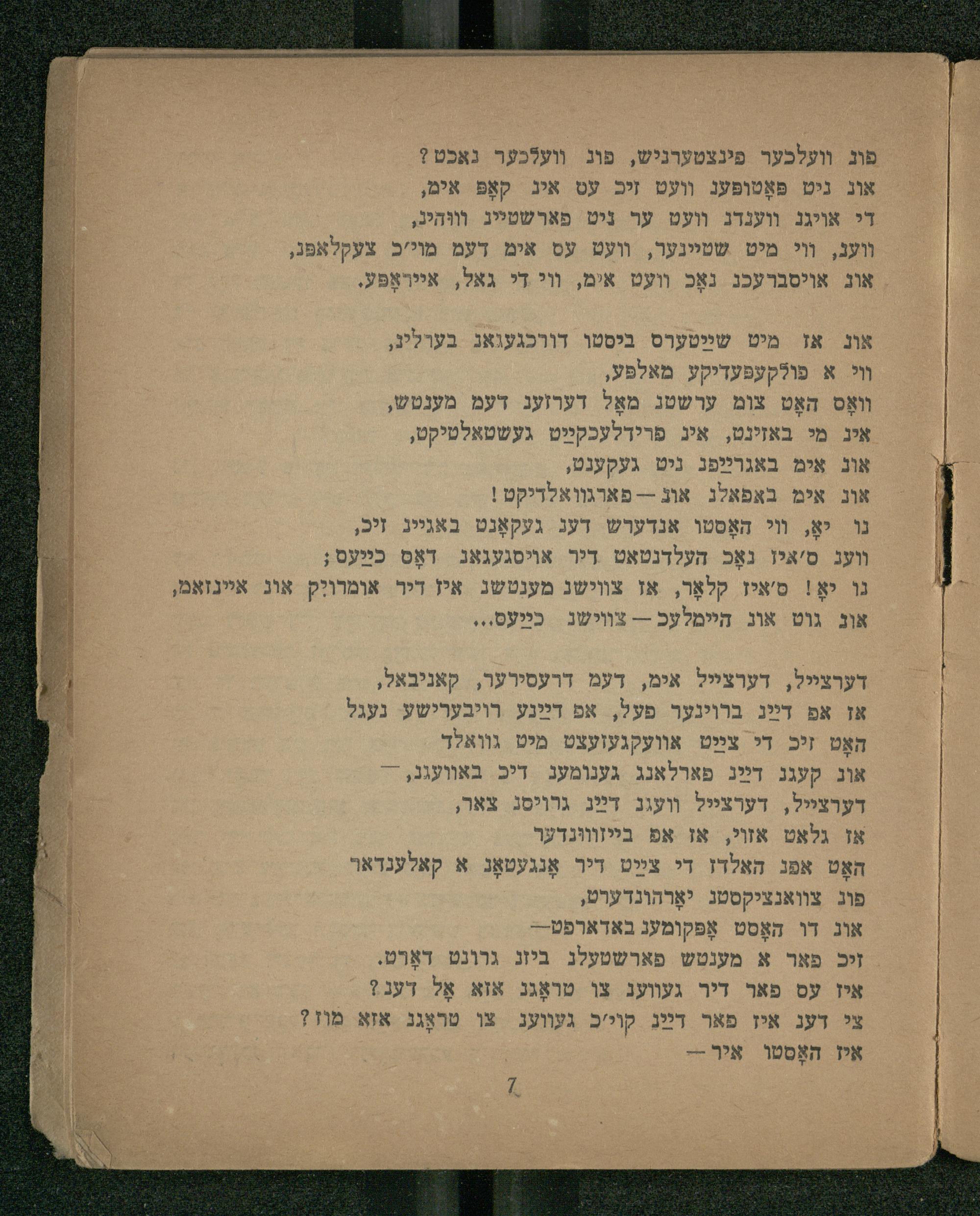 דערצייל, דערצײיל אימ, דעמ דרעסירער, קאניבאל, אז אפ דײַג ברוינער פעל, אפ דײַנע רויבערישע נעגל האָט זיכ די צײַט אוועקגעזעצט מיט גוואלך