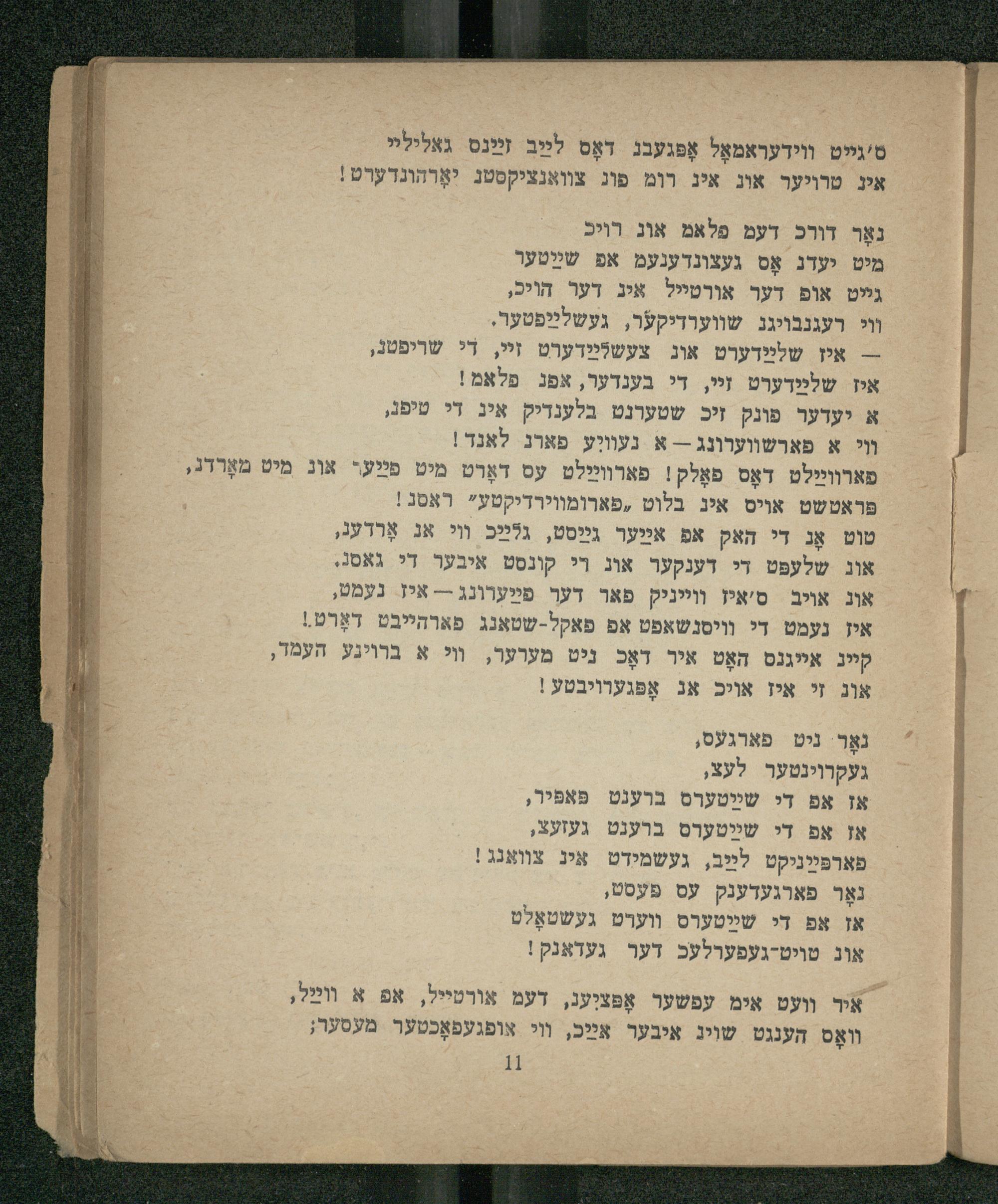 טוט אָנ די האק אפ אײַער גײַסט, גלײַכ װי אנ אָרדעג, אוג שלעפּט די דענקער אונ די קונסט איבער די גאסג. אוג אוב ס'איז וײיניק פאר דעך פײַערונג-- איז נעמט,