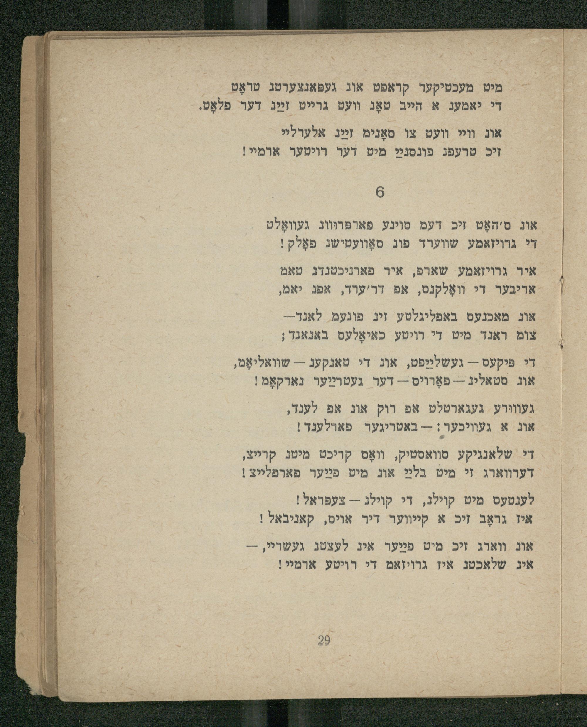 אונ ווארג זיכ מיט פּײַער איג לעצטג געשריי,-איג שלאכטנ איז גרויזאמ די רויטע ארמײי!