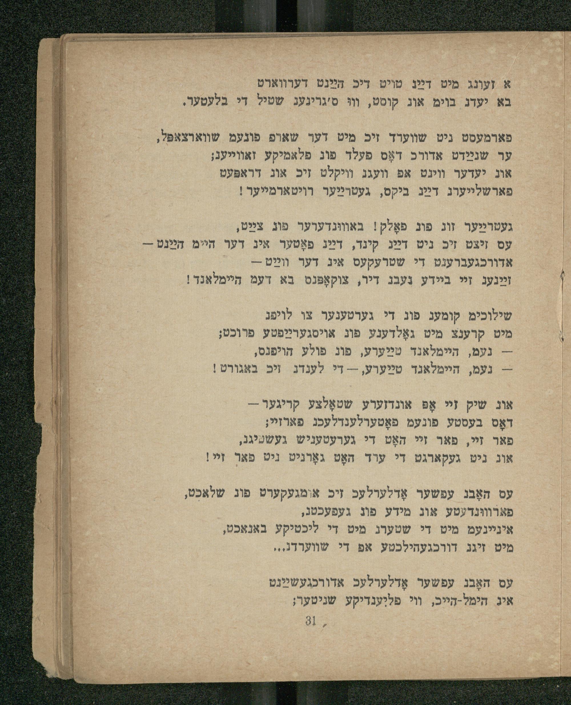 פארמעסט ניט שווערד זיכ מיט דער שארפ פונעמ שווארצאפּל, ער שנײַדט אדורכ דאָס פעלד פונ פלאמיקע זאװײיעג;