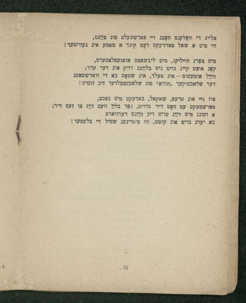 קאָג איצט קייג בױימ ניט בלײַבג רויָק איג דער ערד; װײַל אומעטומ-- אי פעלד, איג שטאָט בֹא די ווארשטאטג דער שלאכטיקער ,הורא" פונ שלאכטפעלדער זיכ הערט!