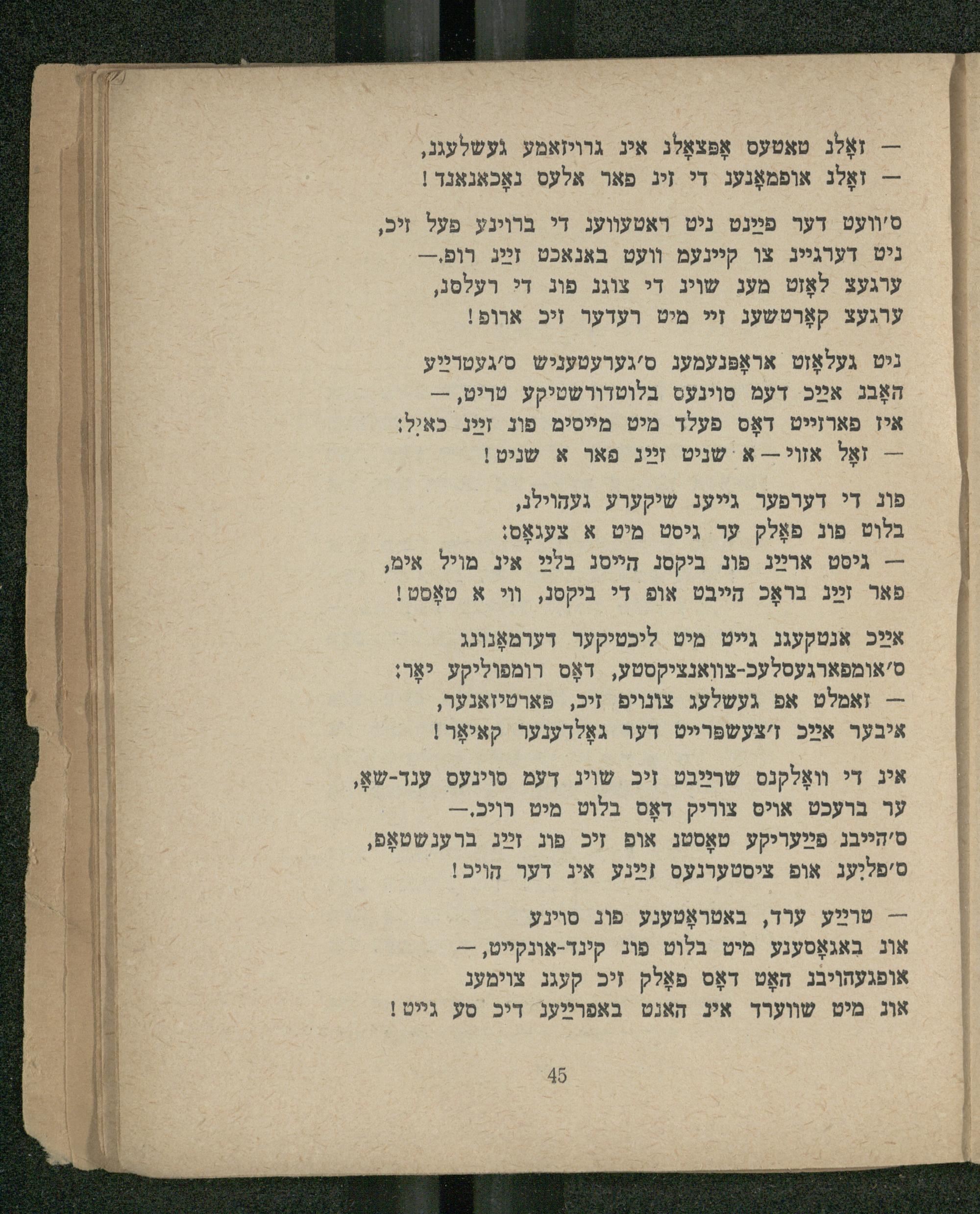 פוג די דערפער גייענ שיקערע געהוילג, בלוט פוג פאָלק ער גיסט מיט א צעגאָס; -- גיסט ארײַג פונ ביקסנ הייסג בלײַ אי מויל אימ, פאר זײַג בראָכ הייבט אופ די ביקסנ, וי א טאָסט!