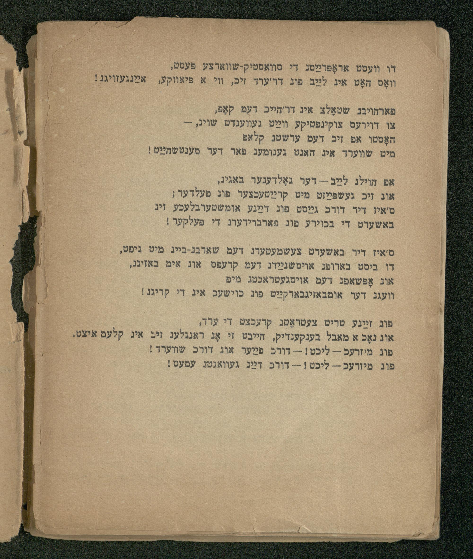 אוג זיכ געשפּײַזט מיט קרײַטעכצער פוג פעלדער; ס'איז דיר דורכ גײַסט פוג דײַנע אומשטערבלעכע זיג באשערט די בכוירע פוג פארברידערג די פעלקער|