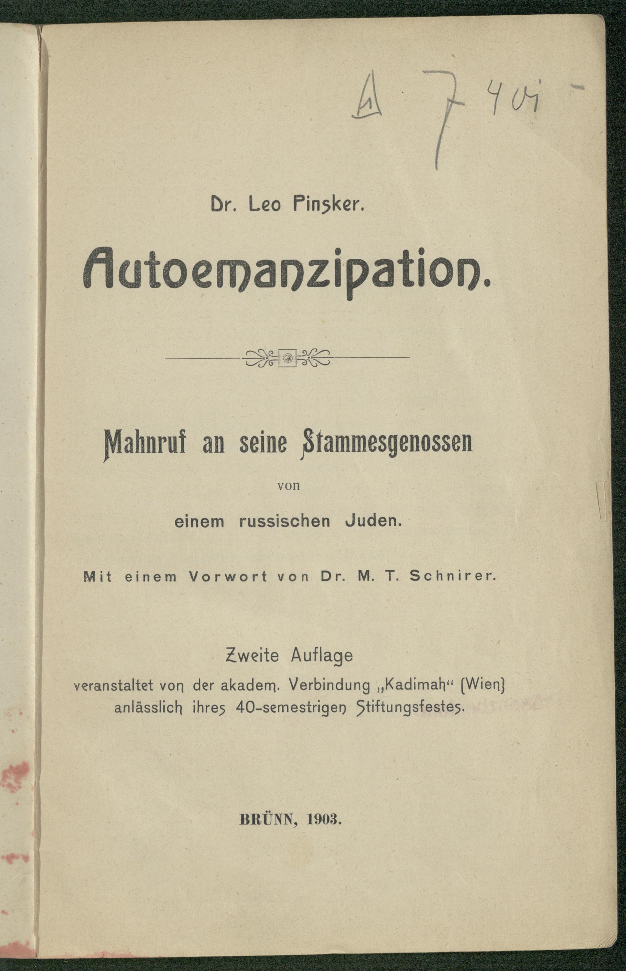 Dr. Leo Pinsker . Autoemanzipation. SE CZ Mahnruf an seine Stammesgenossen von einem russischen Juden. Mit einem Vorwort von Dr. M. T. Schnirer. Zweite Auflage veranstaltet von der akadem. Verbindung„Kadimah ‘“(Wien ) anlässlich ihres 40-semestrigen Stiftungsfestes. BRÜNN , 1903.
