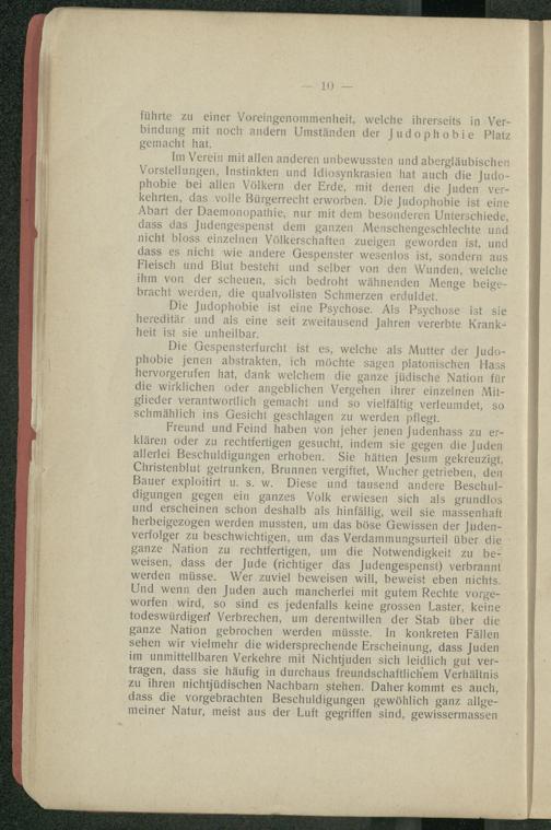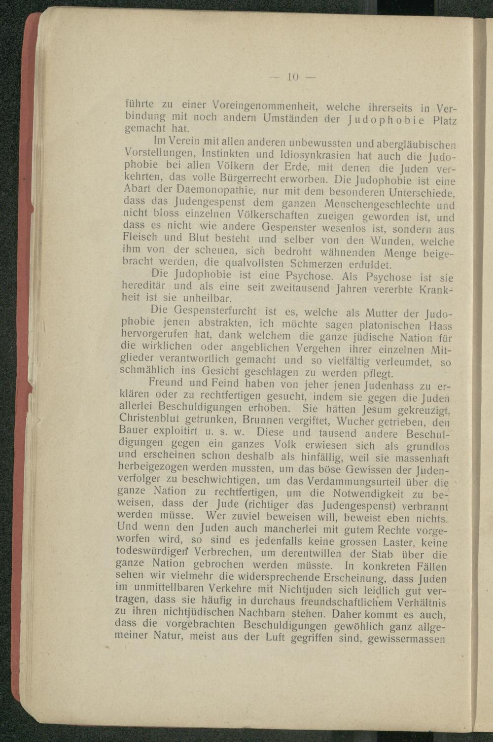 Die Gespensterfurcht ist es, welche als Mutter der Judophobie jenen abstrakten, ich möchte sagen platonischen Hass hervorgerufen hat, dank welchem die ganze jüdische Nation für die wirklichen oder angeblichen Vergehen ihrer einzelnen Mitglieder verantwortlich gemacht und so vielfältig verleumdet, so schmählich ins Gesicht geschlagen zu werden pflegt.