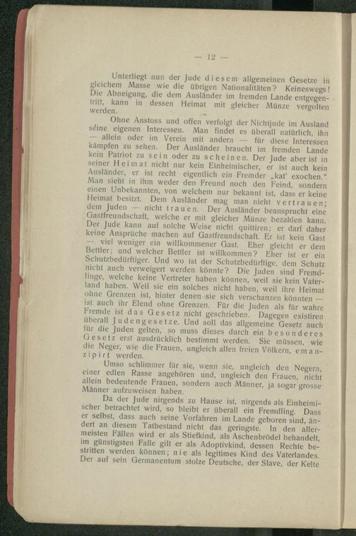 Da der Jude nirgends zu Hause ist, nirgends als Einheimischer betrachtet wird, so bleibt er überall ein Fremdling. Dass er selbst, dass auch seine Vorfahren im Lande geboren sind, ändert an diesem Tatbestand nicht das geringste. In‘ den‘ allermeisten Fällen wird er als Stiefkind, als Aschenbrödel behandelt, im günstigsten Falle gilt er als Adoptivkind, dessen Rechte bestritten. werden können; nie. als legitimes Kind des Vaterlandes. Der auf sein Germanentum stolze Deutsche, ‚der Slave, der Kelte