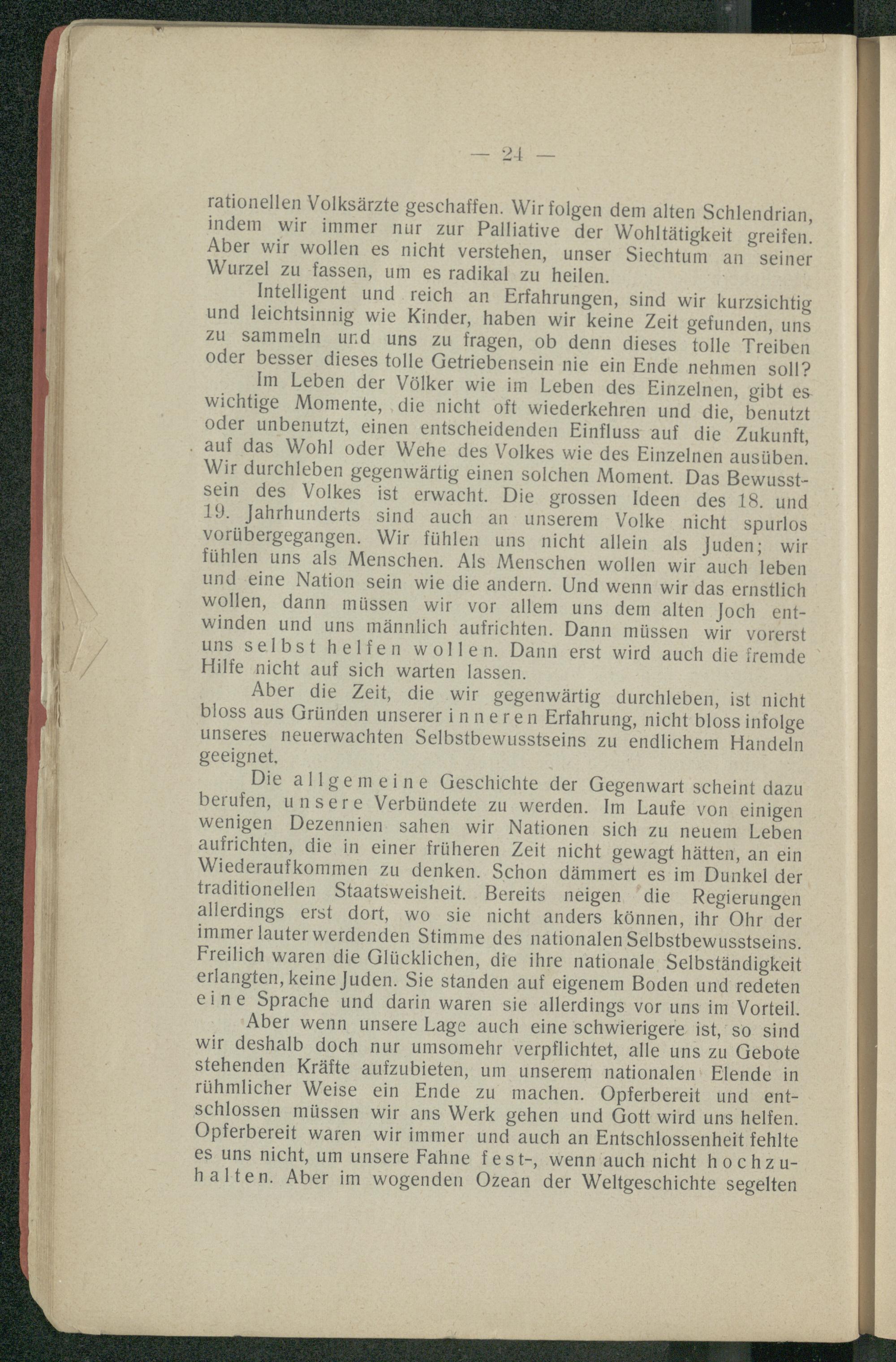 Die allgemeine Geschichte der Gegenwart scheint dazu berufen, unsere Verbündete zu werden. Im Laufe von einigen wenigen Dezennien. sahen wir Nationen sich zu neuem Leben aufrichten, die in einer früheren Zeit nicht gewagt hätten, an ein Wiederaufkommen zu denken. Schon dämmert es im Dunkel der traditionellen Staatsweisheit. Bereits neigen‘ die Regierungen allerdings erst dort, wo sie nicht anders können, ihr Ohr der immer lauter werdenden Stimme des nationalen Selbstbewusstseins. Freilich waren die Glücklichen, die ihre nationale Selbständigkeit erlangten, keine Juden. Sie standen auf eigenem Boden und redeten eine Sprache und darin waren sie allerdings vor uns im Vorteil.