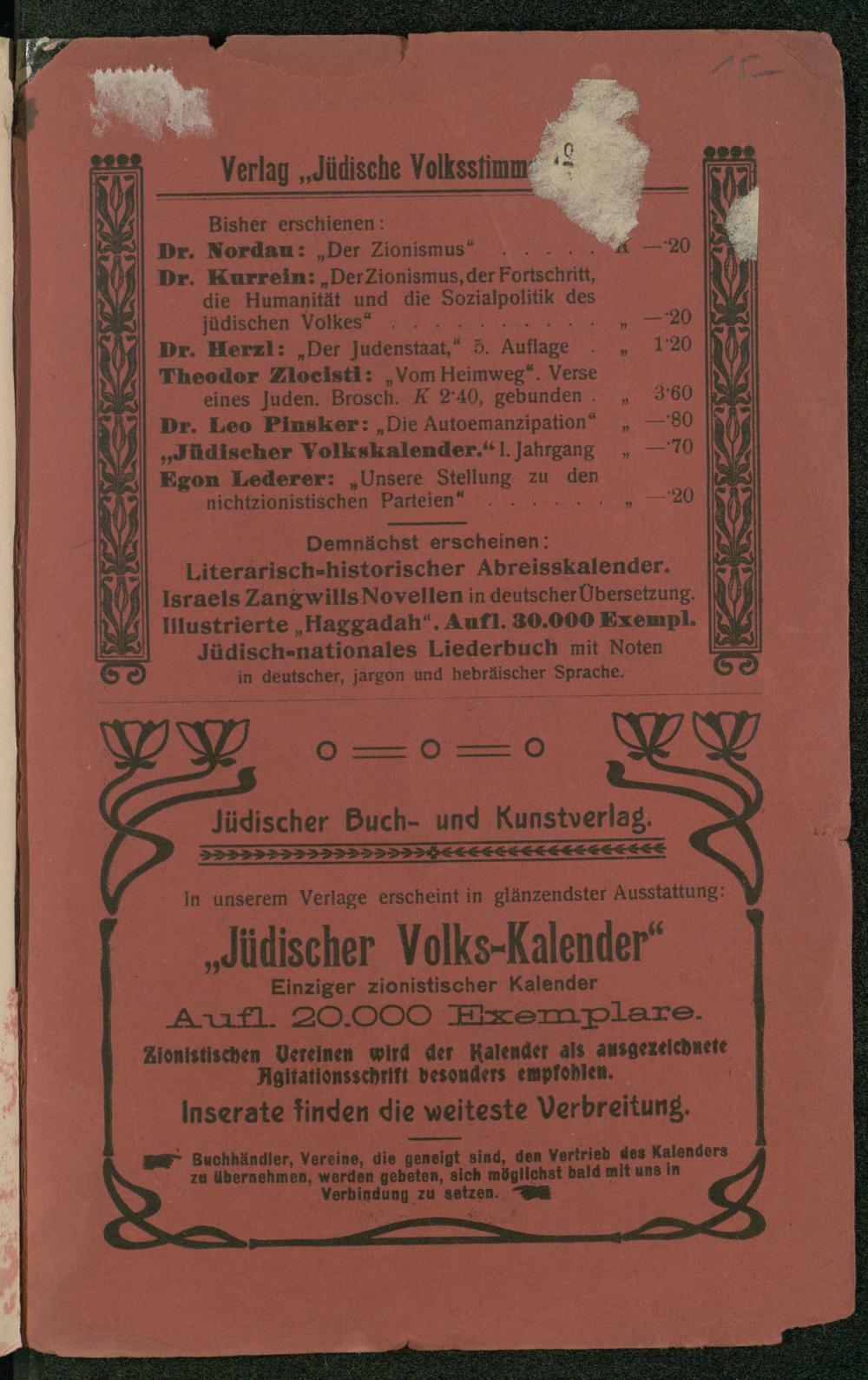 Dr. Herzl:„Der judenstaat,“ 5. Auflage. 120 Theodor Zlocisti:„Vom Heimweg“. Verse 4 eines Juden. Brosch. K 2‘40, gebunden. 3:60 IS Dr. Leo Pinsker:„Die Autoemanzipation“—80 „Jüdischer Volkskalender.‘“ I. Jahrgang—70