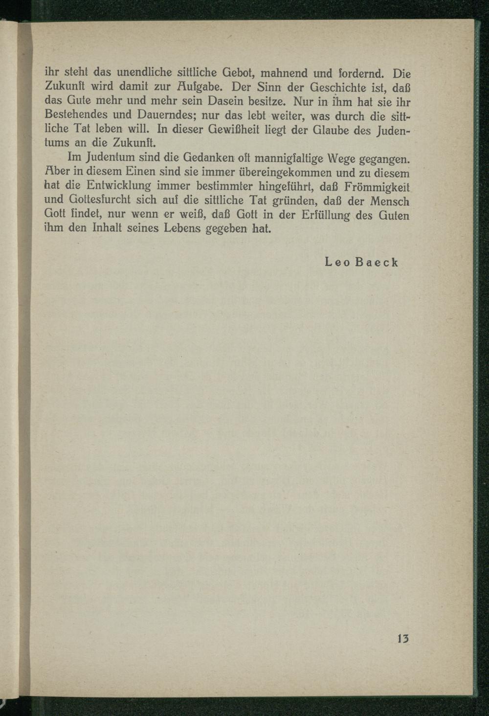 Im Judentum sind die Gedanken oft mannigfaltige Wege gegangen. Aber in diesem Einen sind sie immer übereingekommen und zu diesem hat die Entwicklung immer bestimmter hingeführt, daß Frömmigkeit und Gottesfurcht sich auf die sittliche Tat gründen, daß der Mensch Gott findet, nur wenn er weiß, daß Gott in der Erfüllung des Guten ihm den Inhalt seines Lebens gegeben hat.
