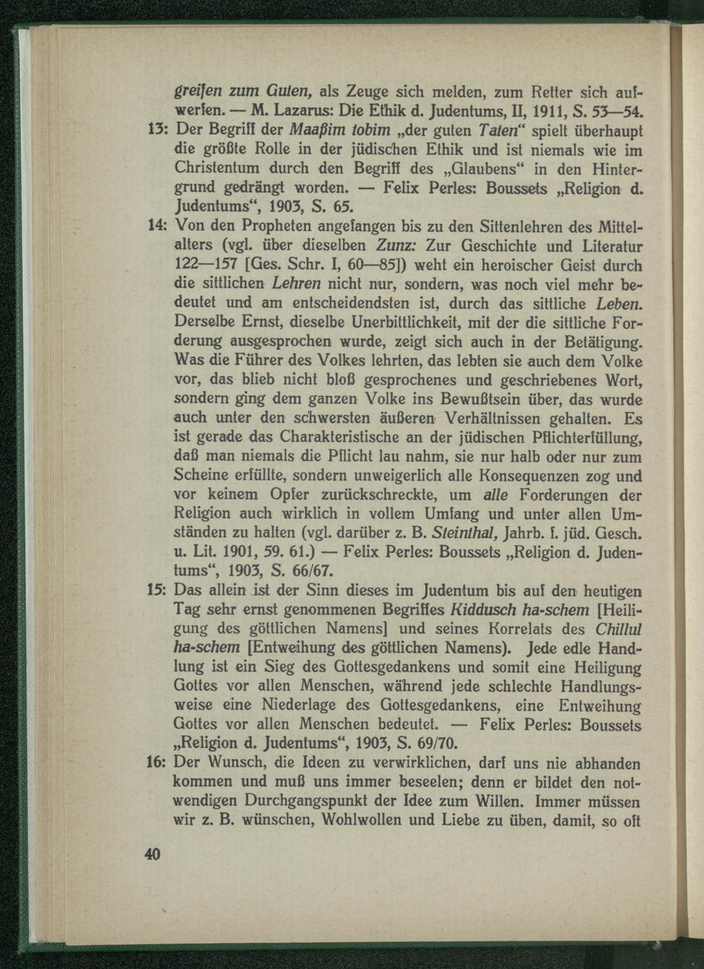 14: Von den Propheten angefangen bis zu den Sittenlehren des Mittelalters (vgl. über dieselben Zunz: Zur Geschichte und Literatur 122—157 [Ges. Sehr. I, 60—85]) weht ein heroischer Geist durch die sittlichen Lehren nicht nur, sondern, was noch viel mehr bedeutet und am entscheidendsten ist, durch das sittliche Leben. Derselbe Ernst, dieselbe Unerbittlichkeit, mit der die sittliche Forderung ausgesprochen wurde, zeigt sich auch in der Betätigung. Was die Führer des Volkes lehrten, das lebten sie auch dem Volke vor, das blieb nicht bloß gesprochenes und geschriebenes Wort, sondern ging dem ganzen Volke ins Bewußtsein über, das wurde auch unter den schwersten äußeren Verhältnissen gehalten. Es ist gerade das Charakteristische an der jüdischen Pflichterfüllung, daß man niemals die Pflicht lau nahm, sie nur halb oder nur zum Scheine erfüllte, sondern unweigerlich alle Konsequenzen zog und vor keinem Opfer zurückschreckte, um alle Forderungen der Religion auch wirklich in vollem Umfang und unter allen Umständen zu halten (vgl. darüber z. B. Steinthal, Jahrb. f. jüd. Gesch. u. Lit. 1901, 59. 61.) — Felix Perles: Boussets „Religion d. Judentums“, 1903, S. 66/67.