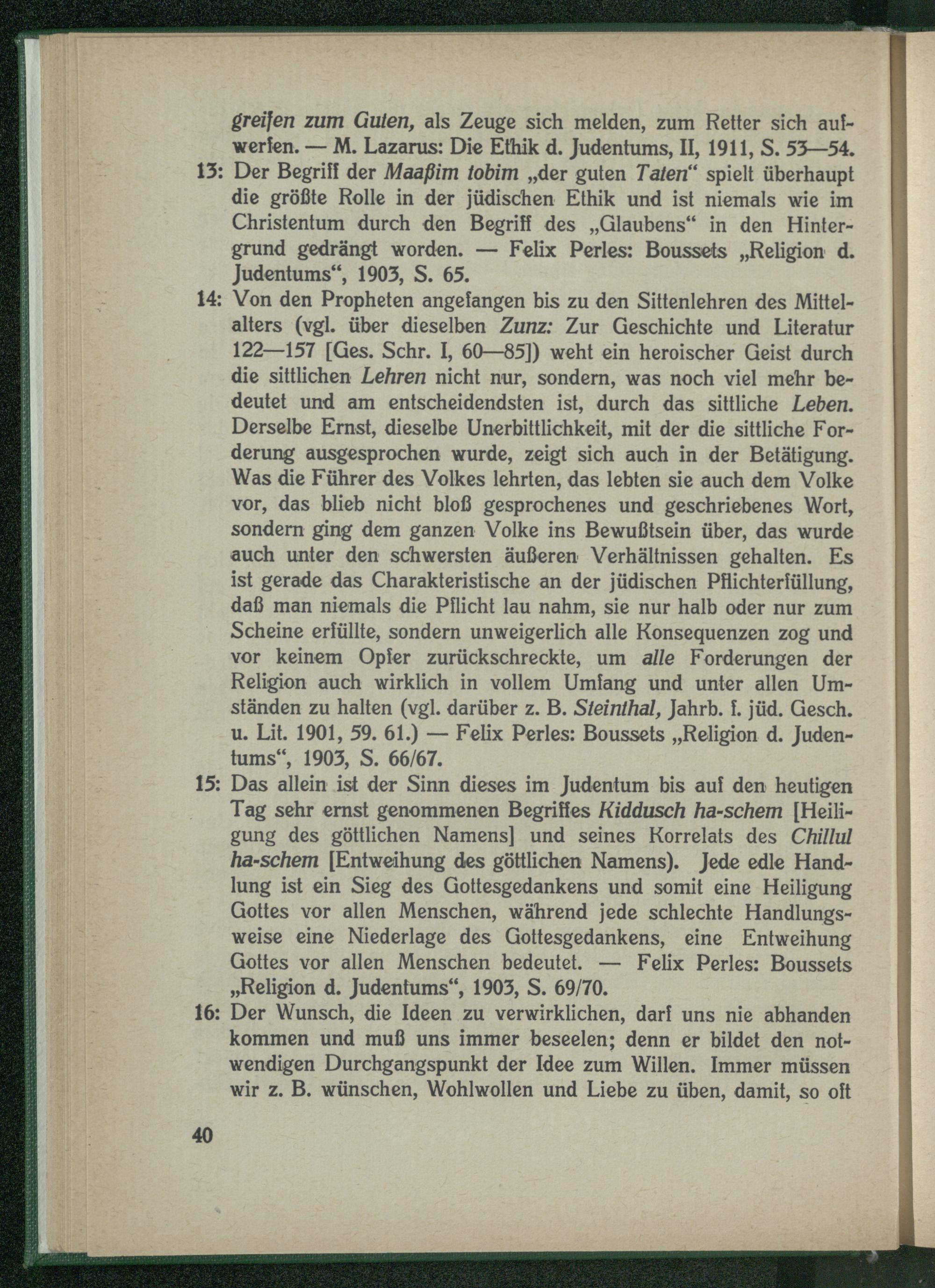 13: Der Begriff der Maaßim tobim „der guten Taten“ spielt überhaupt die größte Rolle in der jüdischen Ethik und ist niemals wie im Christentum durch den Begriff des „Glaubens“ in den Hintergrund gedrängt worden. — Felix Perles: Boussets „Religion d. Judentums“, 1903, S. 65.