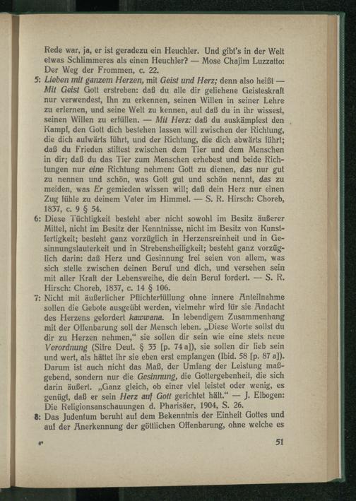 7: Nicht mit äußerlicher Pflichterfüllung ohne innere Anteilnahme sollen die Gebote ausgeübt werden, vielmehr wird für sie Andacht des Herzens gelordert kawwana. In lebendigem Zusammenhang mit der Offenbarung soll der Mensch leben. „Diese Worte sollst du dir zu Herzen nehmen,“ sie sollen dir sein wie eine stets neue Verordnung (Sifre Deut. § 33 [p. 74 a]), sie sollen dir heb sein und wert, als hättet ihr sie eben erst empfangen (Ibid. 58 [p. 87 a]). Darum ist auch nicht das Maß, der Umfang der Leistung maßgebend, sondern nur die Gesinnung, die Gottergebenheit, die sich darin äußert. „Ganz gleich, ob einer viel leistet oder wenig, es genügt, daß er sein Herz auf Gott gerichtet hält.“ — J. Elbogen: Die Religionsanschauungen d. Pharisäer, 1904, S. 26.