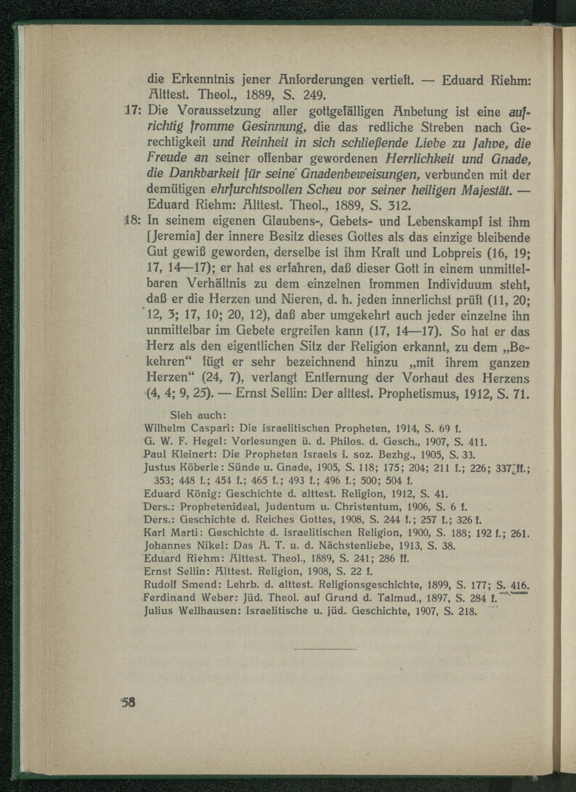 18: In seinem eigenen Glaubens-, Gebets- und Lebenskampf ist ihm [Jeremia] der innere Besitz dieses Gottes als das einzige bleibende Gut gewiß geworden, derselbe ist ihm Kraft und Lobpreis (16, 19; 17, 14—17); er hat es erfahren, daß dieser Gott in einem unmittelbaren Verhältnis zu dem einzelnen frommen Individuum steht, daß er die Herzen und Nieren, d. h. jeden innerlichst prüft (11, 20; 12, 3; 17, 10; 20, 12), daß aber umgekehrt auch jeder einzelne ihn unmittelbar im Gebete ergreifen kann (17, 14—17). So hat er das Herz als den eigentlichen Sitz der Religion erkannt, zu dem „Bekehren“ fügt er sehr bezeichnend hinzu „mit ihrem ganzen Herzen“ (24, 7), verlangt Entfernung der Vorhaut des Herzens (4, 4; 9, 25). — Ernst Sellin: Der alttest. Prophetismus, 1912, S. 71.
