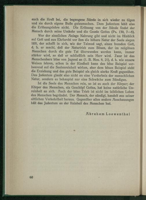 auch die Kraft bei, die begangene Sünde in sich wieder zu tilgen und sie durch eigene Buße gutzumachen. Dem Judentum fehlt also die Erlösungslehre nicht. Die Erlösung von der Sünde findet der Mensch durch seine Umkehr und die Gnade Gottes (Ps. 130, 7—8).