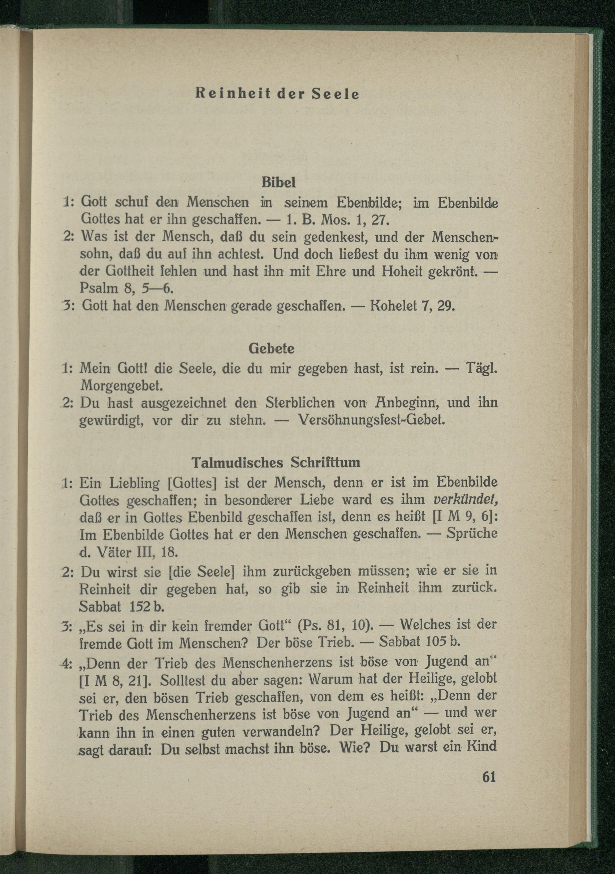 4: „Denn der Trieb des Menschenherzens ist böse von Jugend an“ [I M 8, 21]. Solltest du aber sagen: Warum hat der Heilige, gelobt sei er, den bösen Trieb geschaffen, von dem es heißt: „Denn der Trieb des Menschenherzens ist böse von Jugend an“ — und wer kann ihn in einen guten verwandeln? Der Heilige, gelobt sei er, sagt darauf: Du selbst machst ihn böse. Wie? Du warst ein Kind
