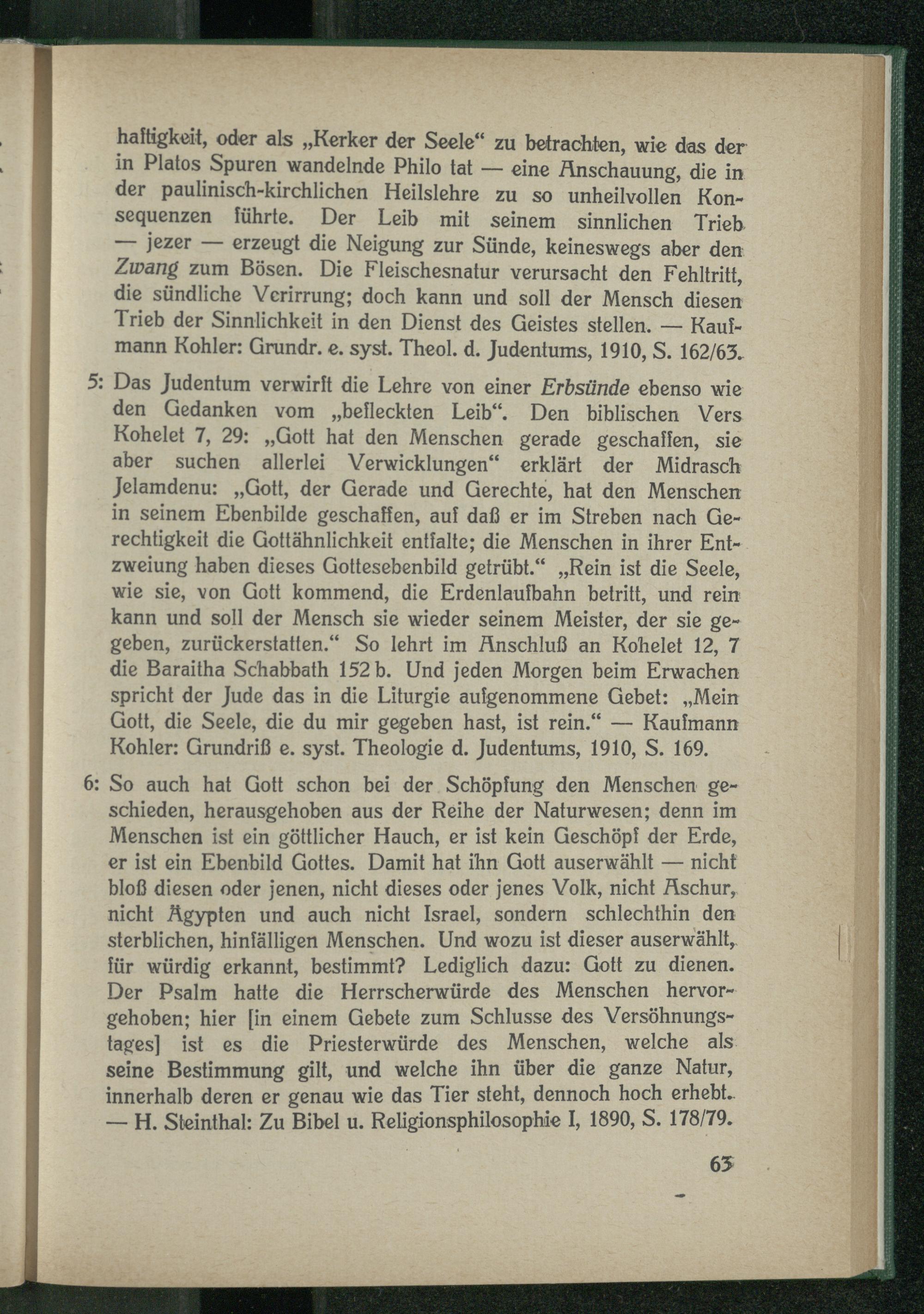 5: Das Judentum verwirft die Lehre von einer Erbsünde ebenso wie den Gedanken vom „befleckten Leib“. Den biblischen Vers Kohelet 7, 29: „Gott hat den Menschen gerade geschaffen, sie aber suchen allerlei Verwicklungen“ erklärt der Midrasch Jelamdenu: „Gott, der Gerade und Gerechte, hat den Menschen in seinem Ebenbilde geschaffen, auf daß er im Streben nach Gerechtigkeit die Gottähnlichkeit entfalte; die Menschen in ihrer Entzweiung haben dieses Gottesebenbild getrübt.“ „Rein ist die Seele, wie sie, von Gott kommend, die Erdenlaufbahn betritt, und rein kann und soll der Mensch sie wieder seinem Meister, der sie gegeben, zurückerstatten.“ So lehrt im Anschluß an Kohelet 12, 7 die Baraitha Schabbath 152 b. Und jeden Morgen beim Erwachen spricht der Jude das in die Liturgie aufgenommene Gebet: „Mein Gott, die Seele, die du mir gegeben hast, ist rein.“ — Kaufmann Köhler: Grundriß e. syst. Theologie d. Judentums, 1910, S. 169.