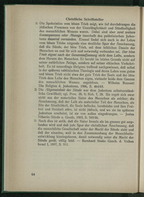 1: Die Spekulation vom bösen Trieb zeigt, wie tief durchdrungen die jüdischen Frommen von der Unzulänglichkeit und Sündhaftigkeit des menschlichen Wesens waren. Dabei sind aber zwei weitere Konsequenzen oder Abwege innerhalb des palästinischen Judentums dauernd vermieden. Einmal findet sich auch in der Lehre vom bösen Triebe nirgends eine deutliche Spur der Anschauung, daß die Sünde, der böse Trieb, mit dem leiblichen Dasein der Menschen an und für sich und notwendig verbunden sei. Der böse Trieb eignet nach der Gesamlauffassung nicht dem Leibe, sondern dem Herzen des Menschen. Er beruht im letzten Grunde nicht auf seiner natürlichen Anlage, sondern auf seiner ethischen Verkehrtheit. Es ist neuerdings übrigens treffend nachgewiesen, daß selbst in der späteren rabbinischen Theologie und deren Lehre vom guten und bösen Trieb nicht etwa der gute Trieb der Seele und der böse Trieb dem Leibe des Menschen eigne, vielmehr beide dem Ganzen des menschlichen Wesens angehören. — Wilhelm Bousset: Die Religion d. Judentums, 1906, S. 464/65.