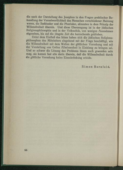 die nach der Darstellung des Josephus in den Fragen praktischer Behandlung der Verantwortlichkeit des Menschen verschiedener Meinung waren, die Sadduzäer und die Pharisäer, stimmten in dem Prinzip der Willensfreiheit überein. Und diese Überzeugung ist in der jüdischen Religionsphilosophie und in der Volksethik, von wenigen Ausnahmen abgesehen, bis auf die jüngste Zeit die herrschende geblieben.