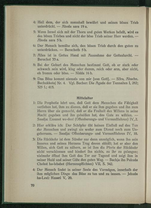 1: Die Prophetie lehrt uns, daß Gott dem Menschen die Fähigkeit verliehen hat, ihm zu dienen, daß er sie ihm gegeben und ihn zum Herrn über sie gemacht, daß er die Freiheit des Willens in seine Macht gegeben und ihn geheißen hat, das Gute zu wählen. — Saadja: Emunot we-deot (Offenbarungs-und Vemunftlehren) IV, 2.