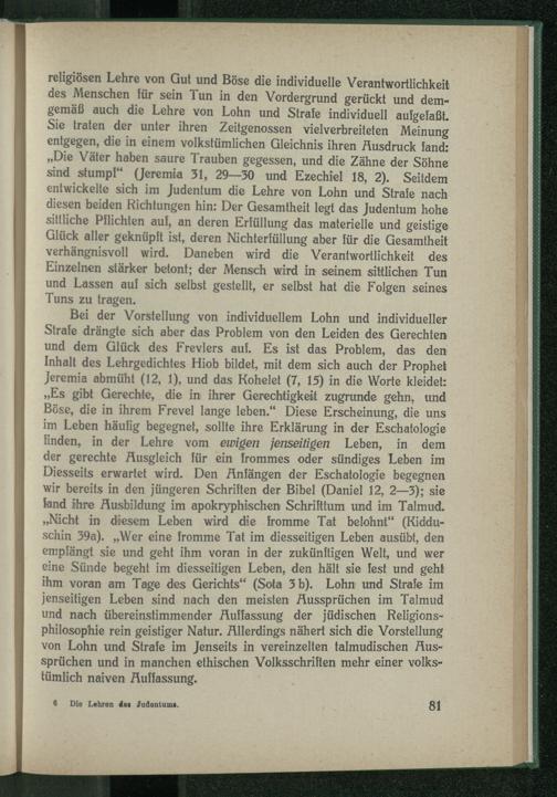 Bei der Vorstellung von individuellem Lohn und individueller Strafe drängte sich aber das Problem von den Leiden des Gerechten und dem Glück des Frevlers auf. Es ist das Problem, das den Inhalt des Lehrgedichtes Hiob bildet, mit dem sich auch der Prophet Jeremia abmüht (12, 1), und das Kohelet (7, 15) in die Worte kleidet: „Es gibt Gerechte, die in ihrer Gerechtigkeit zugrunde gehn, und Böse, die in ihrem Frevel lange leben.“ Diese Erscheinung, die uns im Leben häufig begegnet, sollte ihre Erklärung in der Eschatologie finden, in der Lehre vom ewigen jenseitigen Leben, in dem der gerechte Ausgleich für ein frommes oder sündiges Leben im Diesseits erwartet wird. Den Anfängen der Eschatologie begegnen wir bereits in den jüngeren Schriften der Bibel (Daniel 12, 2—3); sie fand ihre Ausbildung im apokryphischen Schrifttum und im Talmud. „Nicht in diesem Leben wird die fromme Tat belohnt“ (Kiddu- schin 39a). „Wer eine fromme Tat im diesseitigen Leben ausübt, den empfängt sie und geht ihm voran in der zukünftigen Welt, und wer eine Sünde begeht im diesseitigen Leben, den hält sie fest und geht ihm voran am Tage des Gerichts“ (Sota 3 b). Lohn und Strafe im jenseitigen Leben sind nach den meisten Aussprüchen im Talmud und nach übereinstimmender Auffassung der jüdischen Religionsphilosophie rein geistiger Natur. Allerdings nähert sich die Vorstellung von Lohn und Strafe im Jenseits in vereinzelten talmudischen Aussprüchen und in manchen ethischen Volksschriften mehr einer volkstümlich naiven Auffassung.