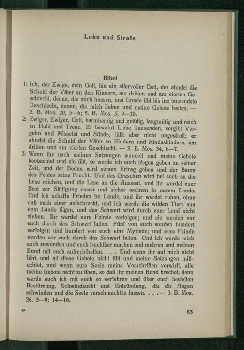 1: Ich, der Ewige, dein Gott, bin ein eifervoller Gott, der ahndet die Schuld der Väter an den Kindern, am dritten und am vierten Ge- schlecht, denen, die mich hassen, und Gnade übt bis ins tausendste Geschlecht, denen, die mich lieben und meine Gebote halten. — 2. B. Mos. 20, 5—6; 5. B. Mos. 5, 9—10.