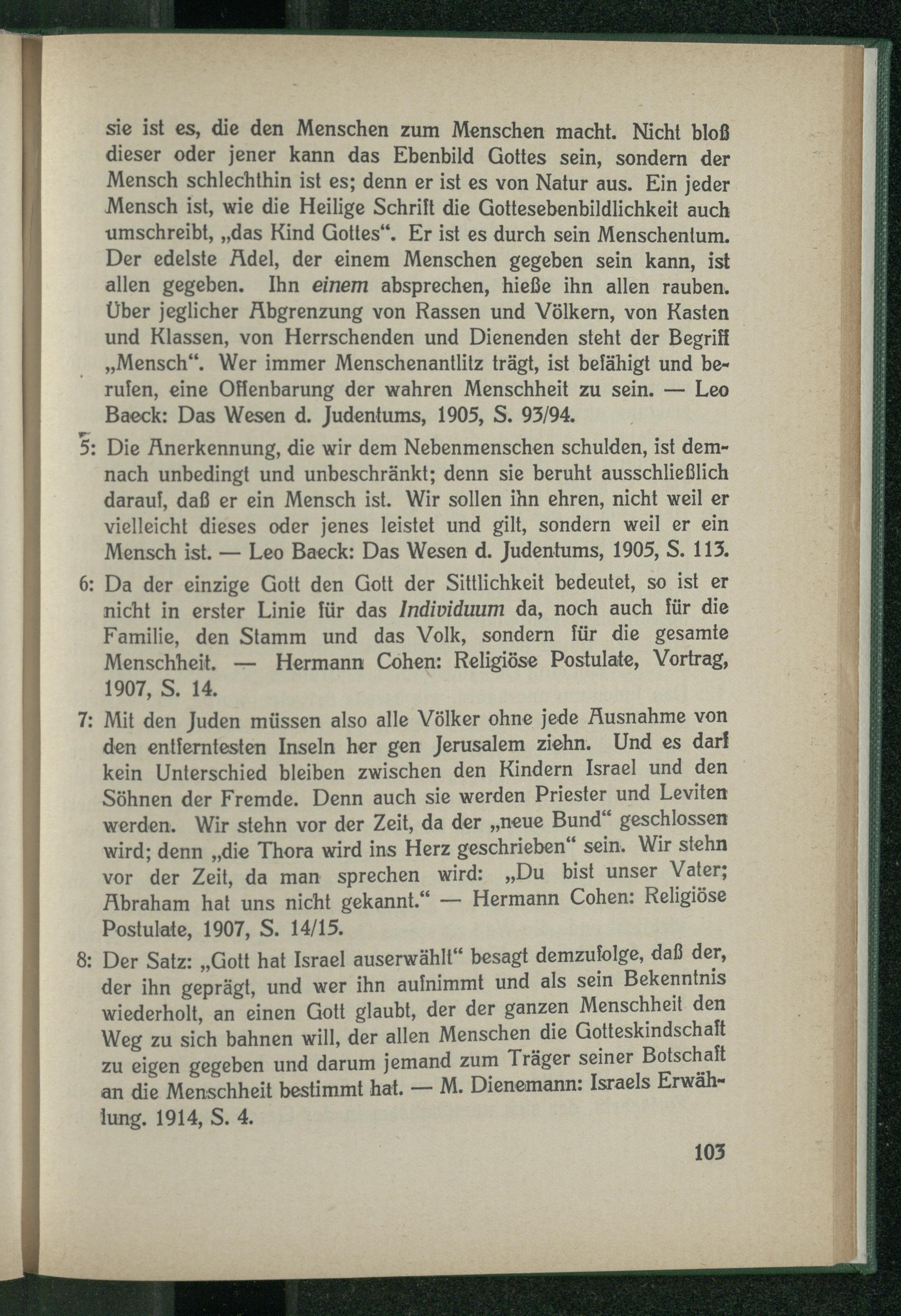 5: Die Anerkennung, die wir dem Nebenmenschen schulden, ist demnach unbedingt und unbeschränkt; denn sie beruht ausschließlich daraul, daß er ein Mensch ist. Wir sollen ihn ehren, nicht weil er vielleicht dieses oder jenes leistet und gilt, sondern weil er ein Mensch ist. — Leo Baeck: Das Wesen d. Judentums, 1905, S. 113.