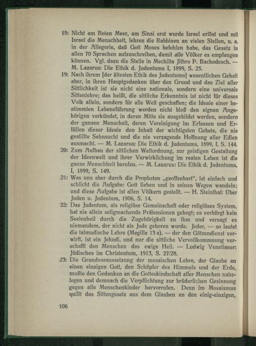 19: Nach ihrem [der ältesten Ethik des Judentums] wesentlichen Gehalt aber, in ihren Hauptgedanken über den Grund und das Ziel aller Sittlichkeit ist sie nicht eine nationale, sondern eine universale Sittenlehre; das heißt, die sittliche Erkenntnis ist nicht für dieses Volk allein, sondern für alle Welt geschaffen; die Ideale einer bestimmten Lebensführung werden nicht bloß den eignen Angehörigen verkündet, in deren Mitte sie ausgebildet werden, sondern der ganzen Menscheit, deren Vereinigung im Erfassen und Erfüllen dieser Ideale den Inhalt der wichtigsten Gebete, die nie gestillte Sehnsucht und die nie verzagende Hoffnung aller Edlen ausmacht. — M. Lazarus: Die Ethik d. Judentums, 1899, I, S. 144.