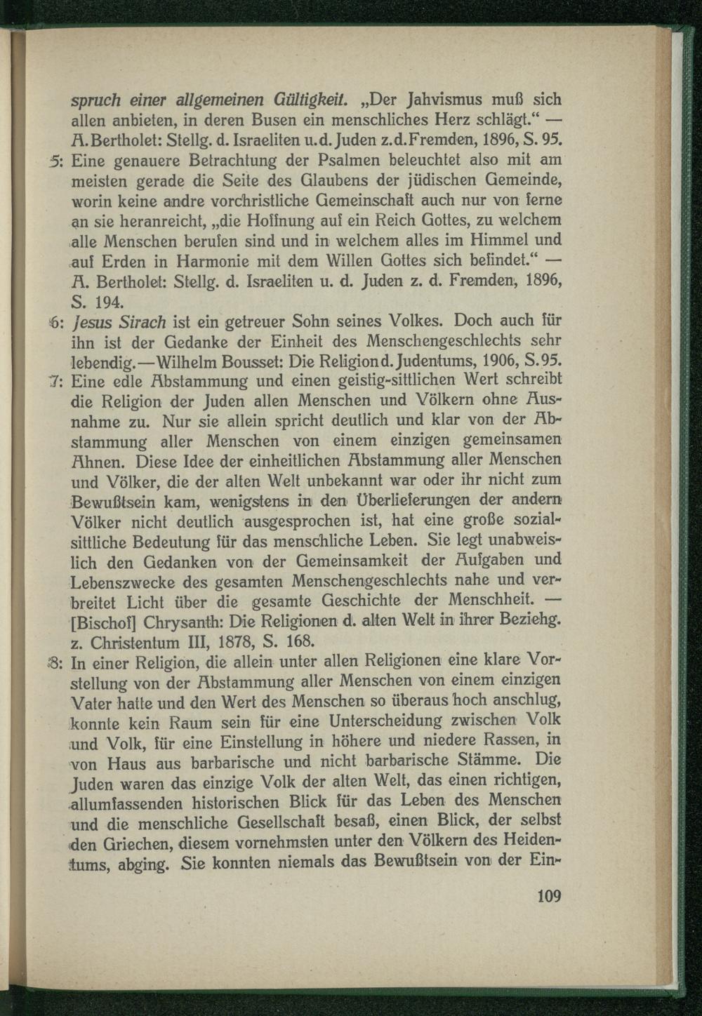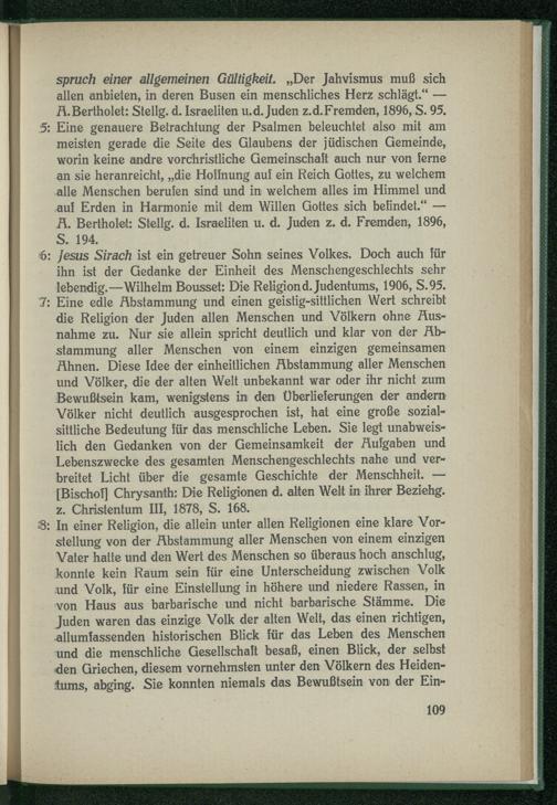 7: Eine edle Äbstammung und einen geistig-sittlichen Wert schreibt die Religion der Juden allen Menschen und Völkern ohne Ausnahme zu. Nur sie allein spricht deutlich und klar von der Äbstammung aller Menschen von einem einzigen gemeinsamen Ahnen. Diese Idee der einheitlichen Abstammung aller Menschen und Völker, die der alten Welt unbekannt war oder ihr nicht zum Bewußtsein kam, wenigstens in den Überlieferungen der andern Völker nicht deutlich ausgesprochen ist, hat eine große sozialsittliche Bedeutung für das menschliche Leben. Sie legt unabweis- lich den Gedanken von der Gemeinsamkeit der Aufgaben und Lebenszwecke des gesamten Menschengeschlechts nahe und verbreitet Licht über die gesamte Geschichte der Menschheit. — [Bischof] Chrysanth: Die Religionen d. alten Welt in ihrer Beziehg. z. Christentum III, 1878, S. 168.