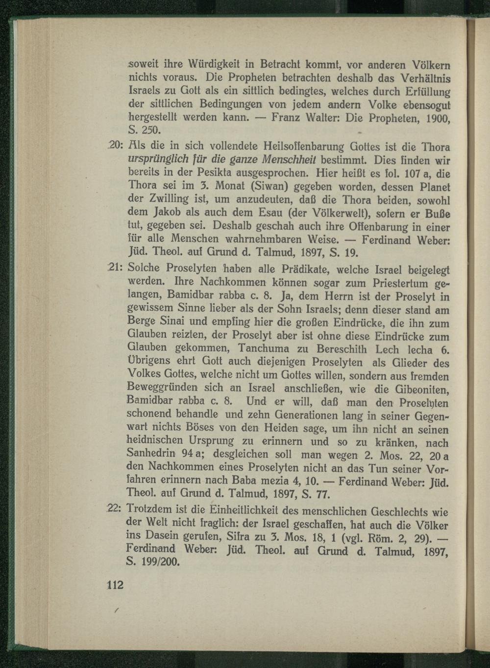 22: Trotzdem ist die Einheitlichkeit des menschlichen Geschlechts wie der Welt nicht fraglich: der Israel geschaffen, hat auch die Völker ins Dasein gerufen, Sifra zu 3. Mos. 18, 1 (vgl. Röm. 2, 29). — Ferdinand Weber: Jüd. Theol. auf Grund d. Talmud, 1897, S. 199/200.