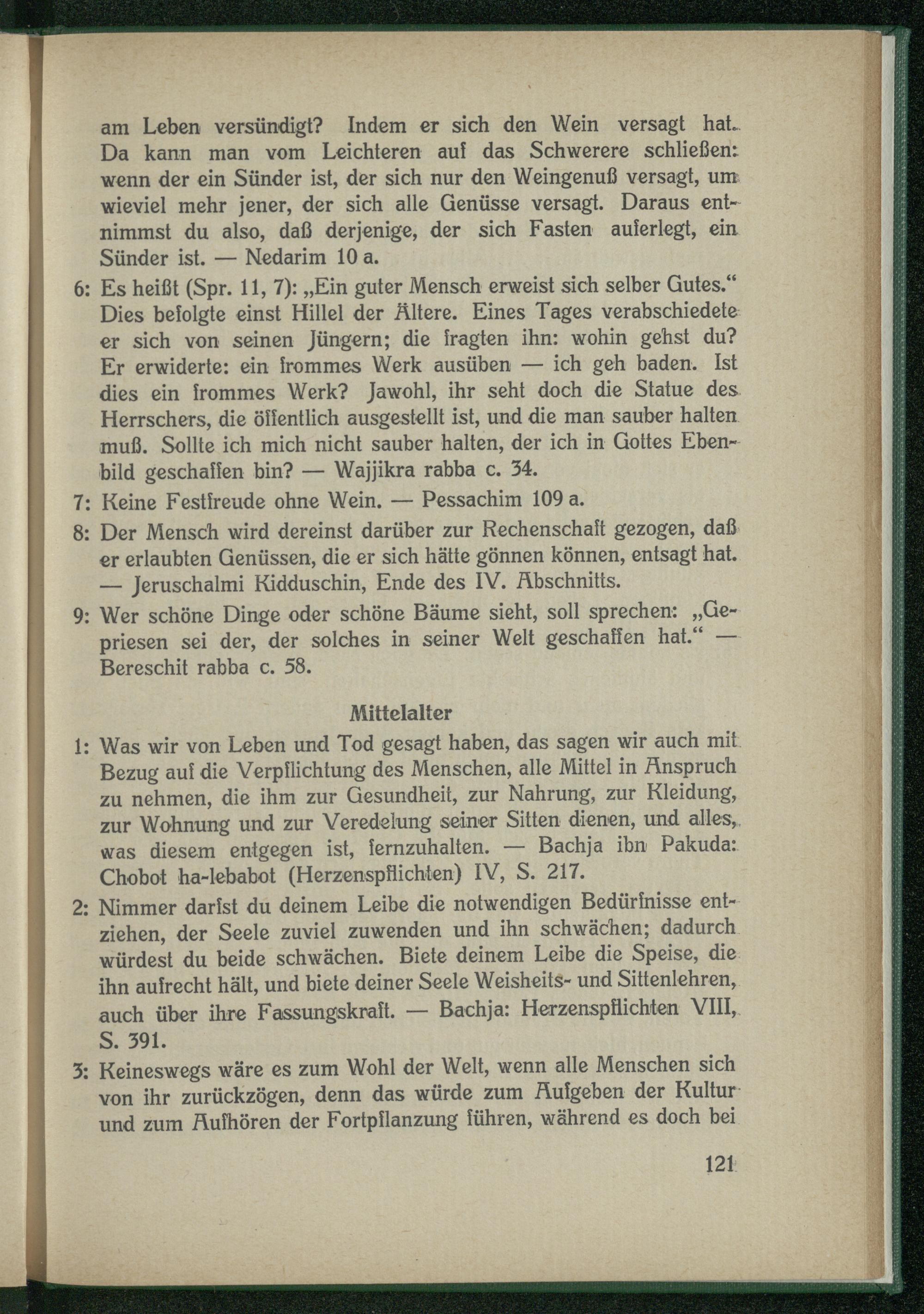 1: Was wir von Leben und Tod gesagt haben, das sagen wir auch mit Bezug auf die Verpflichtung des Menschen, alle Mittel in Anspruch zu nehmen, die ihm zur Gesundheit, zur Nahrung, zur Kleidung, zur Wohnung und zur Veredelung seiner Sitten dienen, und alles, was diesem entgegen ist, femzuhalten. — Bachja ihn Pakuda: Chobot ha-lebabot (Herzenspflichten) IV, S. 217.