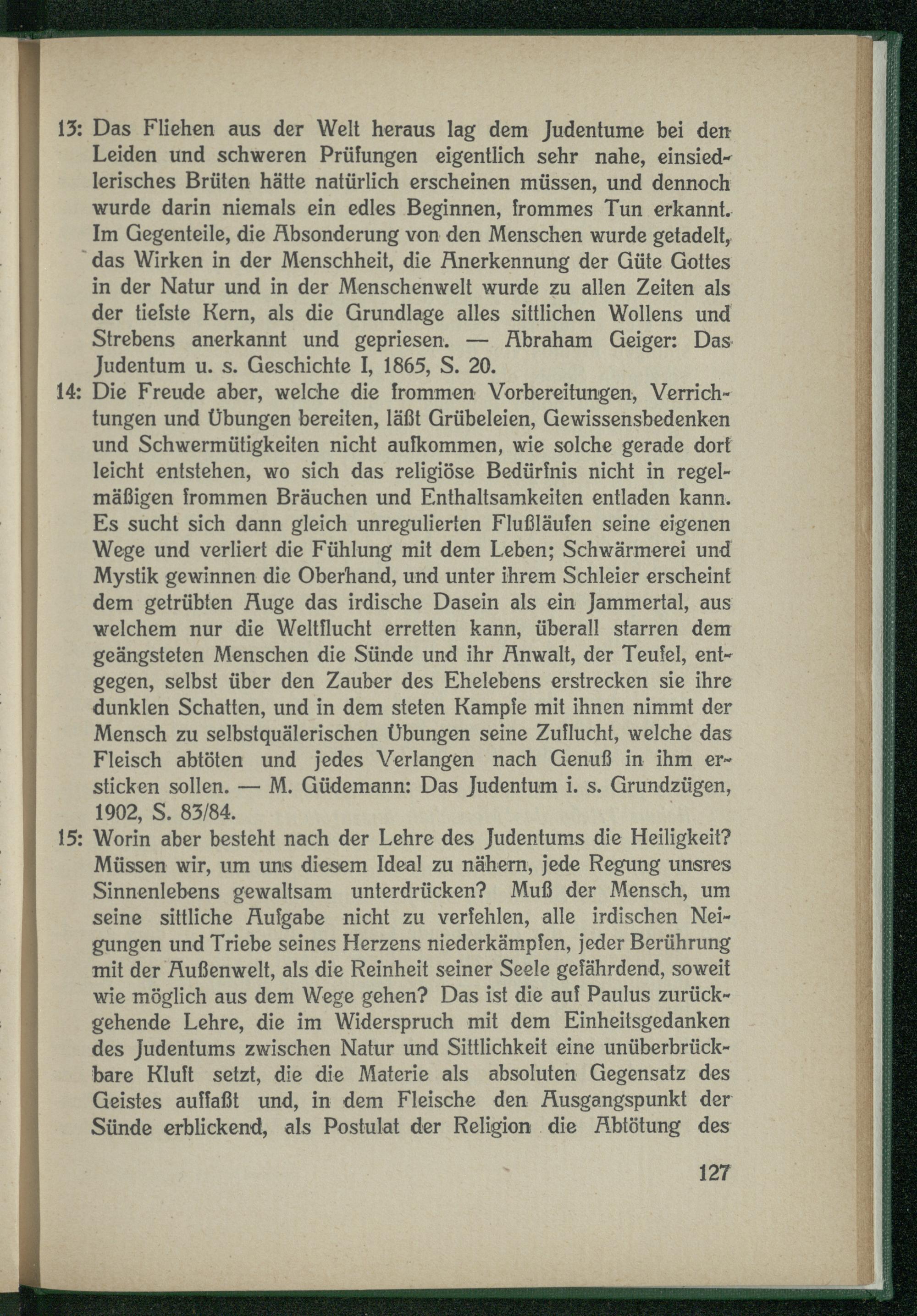 13: Das Fliehen aus der Welt heraus lag dem Judentume bei den Leiden und schweren Prüfungen eigentlich sehr nahe, einsiedlerisches Brüten hätte natürlich erscheinen müssen, und dennoch wurde darin niemals ein edles Beginnen, frommes Tun erkannt. Im Gegenteile, die Absonderung von den Menschen wurde getadelt, ' das Wirken in der Menschheit, die Anerkennung der Güte Gottes in der Natur und in der Menschenwelt wurde zu allen Zeiten als der tiefste Kern, als die Grundlage alles sittlichen Wollens und Strebens anerkannt und gepriesen. — Abraham Geiger: Das Judentum u. s. Geschichte I, 1865, S. 20.