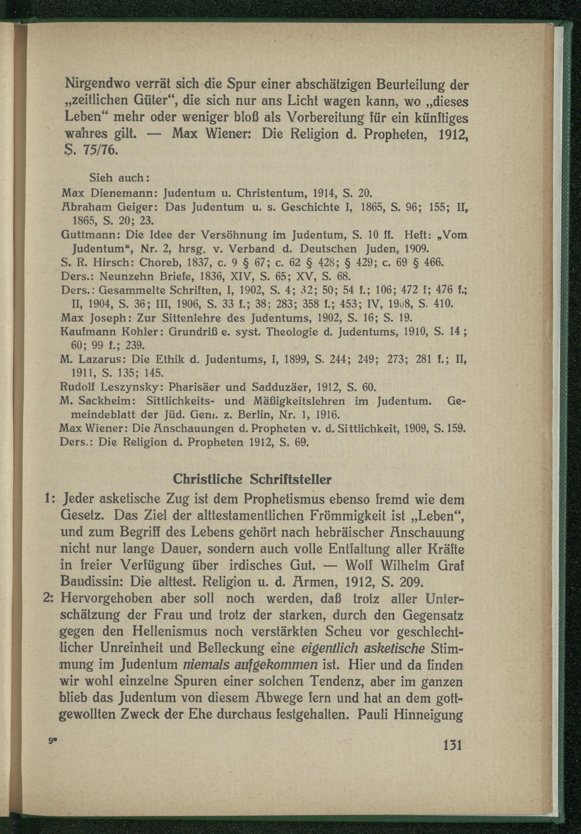 Nirgendwo verrät sich die Spur einer abschätzigen Beurteilung der „zeitlichen Güter“, die sich nur ans Licht wagen kann, wo „dieses Leben“ mehr oder weniger bloß als Vorbereitung für ein künftiges wahres gilt. — Max Wiener: Die Religion d. Propheten, 1912, S. 75/76.