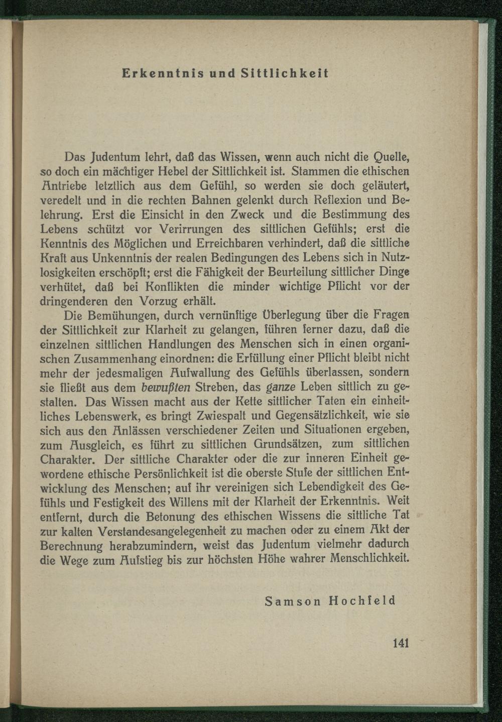 Die Bemühungen, durch vernünftige Überlegung über die Fragen der Sittlichkeit zur Klarheit zu gelangen, führen ferner dazu, daß die einzelnen sittlichen Handlungen des Menschen sich in einen organischen Zusammenhang einordnen: die Erfüllung einer Pflicht bleibt nicht mehr der jedesmaligen Aufwallung des Gefühls überlassen, sondern sie fließt aus dem bewußten Streben, das ganze Leben sittlich zu gestalten. Das Wissen macht aus der Kette sittlicher Taten ein einheitliches Lebenswerk, es bringt Zwiespalt und Gegensätzlichkeit, wie sie sich aus den Anlässen verschiedener Zeiten und Situationen ergeben, zum Ausgleich, es führt zu sittlichen Grundsätzen, zum sittlichen Charakter. Der sittliche Charakter oder die zur inneren Einheit gewordene ethische Persönlichkeit ist die oberste Stufe der sittlichen Entwicklung des Menschen; auf ihr vereinigen sich Lebendigkeit des Gefühls und Festigkeit des Willens mit der Klarheit der Erkenntnis. Weit entfernt, durch die Betonung des ethischen Wissens die sittliche Tat zur kalten Verstandesangelegenheit zu machen oder zu einem Akt der Berechnung herabzumindem, weist das Judentum vielmehr dadurch die Wege zum Aufstieg bis zur höchsten Höhe wahrer Menschlichkeit.
