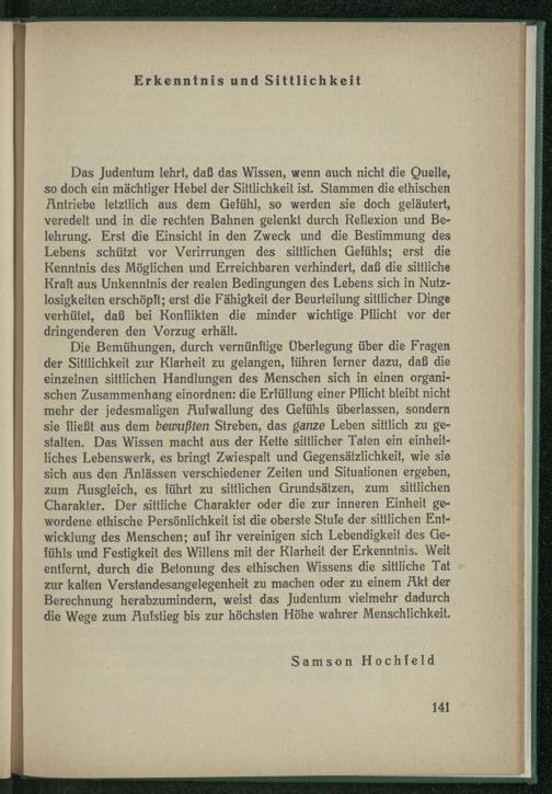 Das Judentum lehrt, daß das Wissen, wenn auch nicht die Quelle, so doch ein mächtiger Hebel der Sittlichkeit ist. Stammen die ethischen Antriebe letztlich aus dem Gefühl, so werden sie doch geläutert, veredelt und in die rechten Bahnen gelenkt durch Reflexion und Belehrung. Erst die Einsicht in den Zweck und die Bestimmung des Lebens schützt vor Verirrungen des sittlichen Gefühls; erst die Kenntnis des Möglichen und Erreichbaren verhindert, daß die sittliche Kraft aus Unkenntnis der realen Bedingungen des Lebens sich in Nutzlosigkeiten erschöpft; erst die Fähigkeit der Beurteilung sittlicher Dinge verhütet, daß bei Konflikten die minder wichtige Pflicht vor der dringenderen den Vorzug erhält.