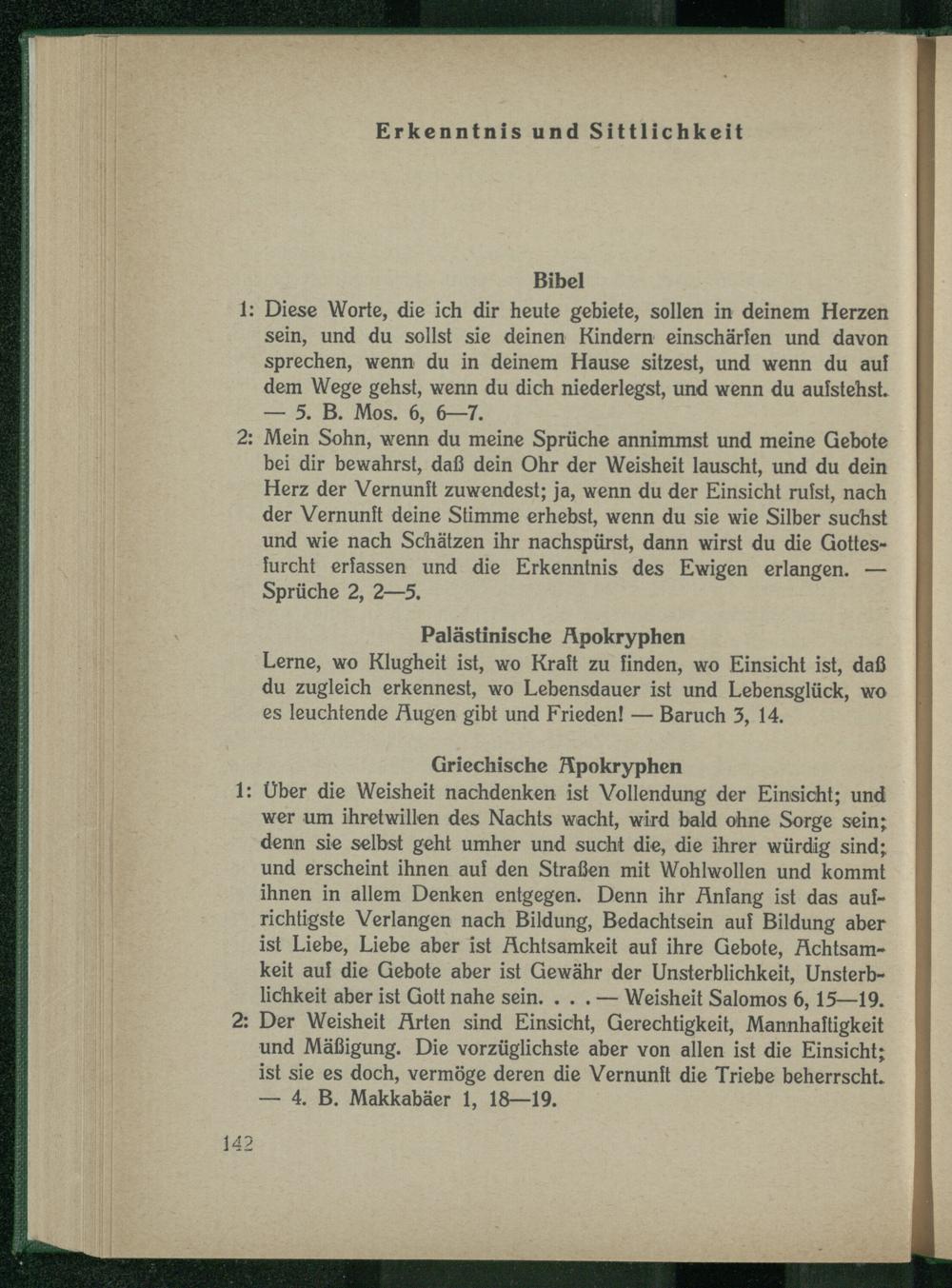 2: Der Weisheit Arten sind Einsicht, Gerechtigkeit, Mannhaftigkeit und Mäßigung. Die vorzüglichste aber von allen ist die Einsicht; ist sie es doch, vermöge deren die Vernunft die Triebe beherrscht. — 4. B. Makkabäer 1, 18—19.