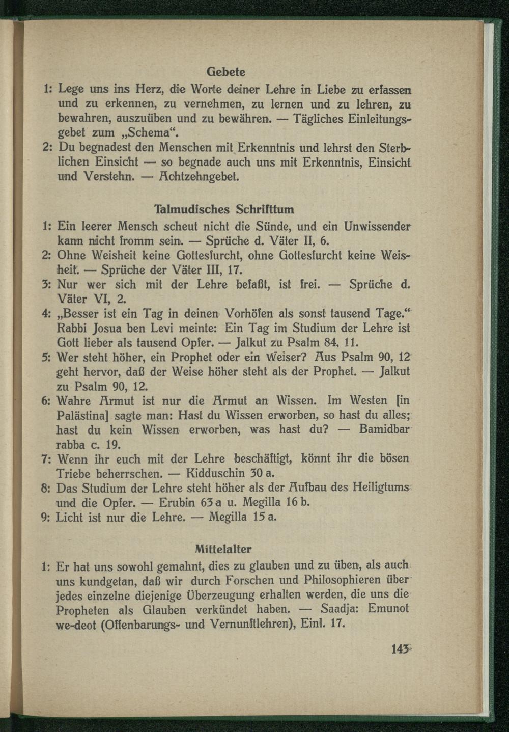 1: Er hat uns sowohl gemahnt, dies zu glauben und zu üben, als auch uns kundgetan, daß wir durch Forschen und Philosophieren über jedes einzelne diejenige Überzeugung erhalten werden, die uns die Propheten als Glauben verkündet haben. — Saadja: Emunot we-deot (Offenbarungs- und Vernunftlehren), Einl. 17.