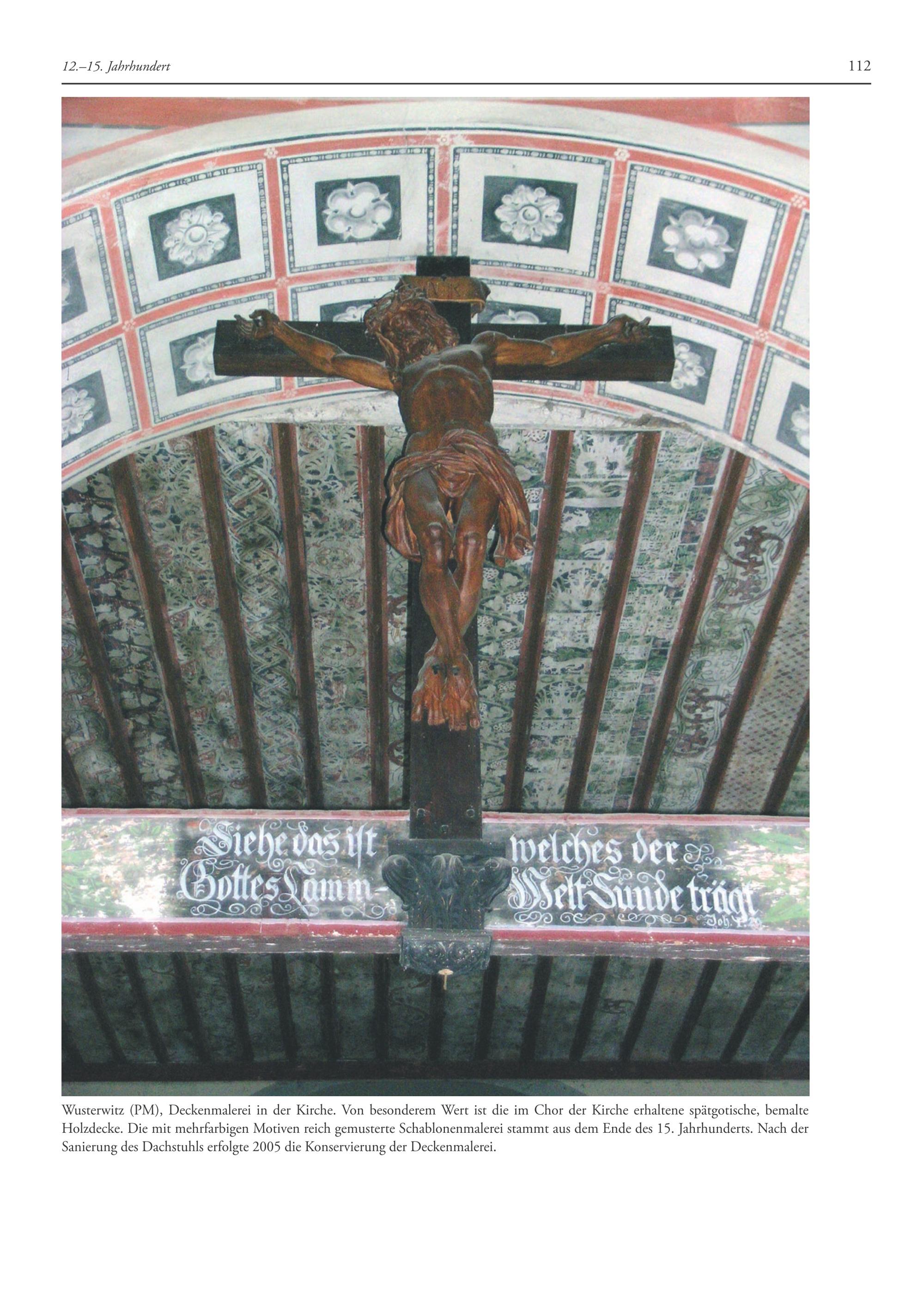 Wusterwitz(PM), Deckenmalerei in der Kirche. Von besonderem Wert ist die im Chor der Kirche erhaltene spätgotische, bemalte Holzdecke. Die mit mehrfarbigen Motiven reich gemusterte Schablonenmalerei stammt aus dem Ende des 15. Jahrhunderts. Nach der Sanierung des Dachstuhls erfolgte 2005 die Konservierung der Deckenmalerei.