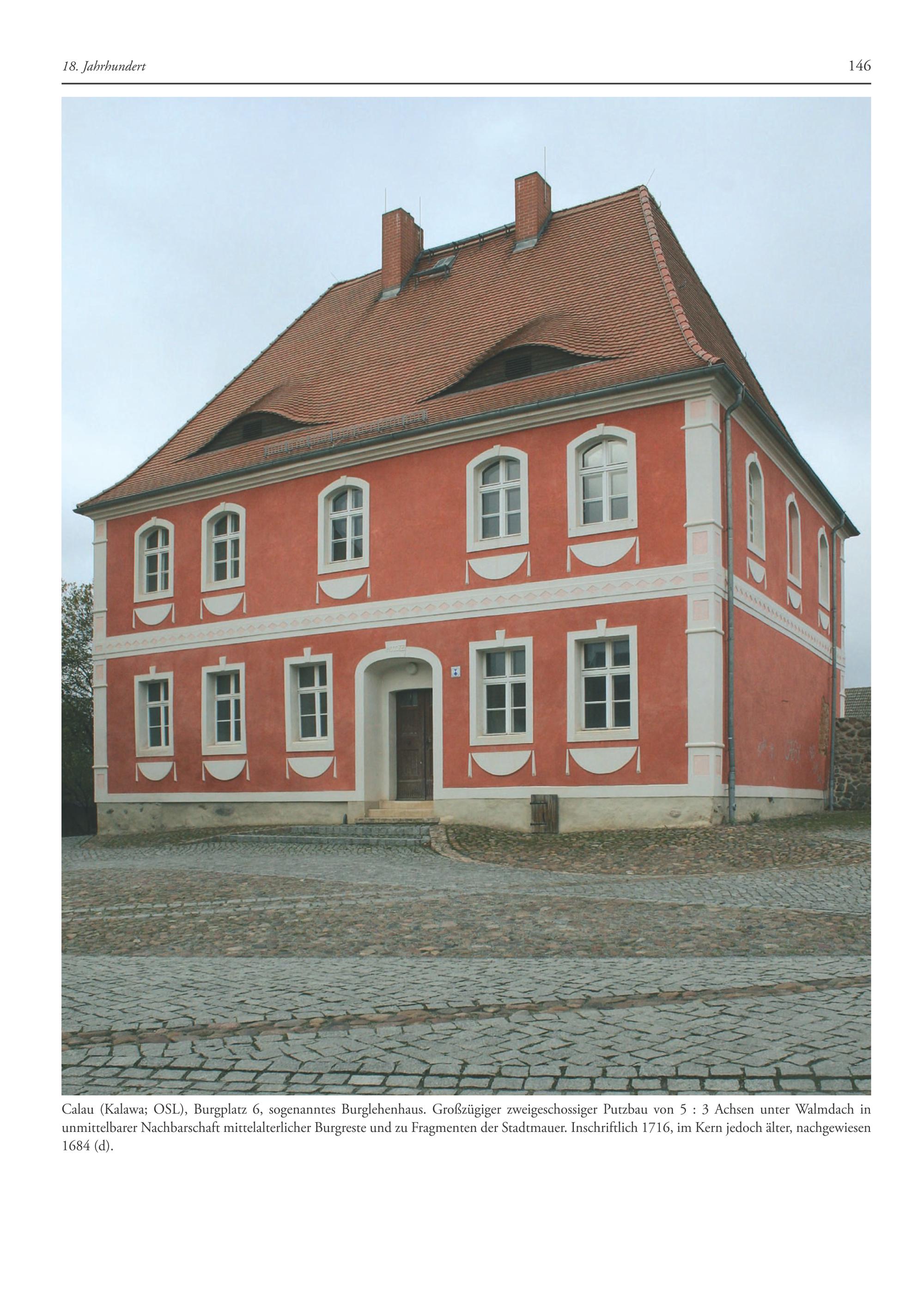 Calau(Kalawa; OSL), Burgplatz 6, sogenanntes Burglehenhaus. Großzügiger zweigeschossiger Putzbau von 5: 3 Achsen unter Walmdach in unmittelbarer Nachbarschaft mittelalterlicher Burgreste und zu Fragmenten der Stadtmauer. Inschriftlich 1716, im Kern jedoch älter, nachgewiesen